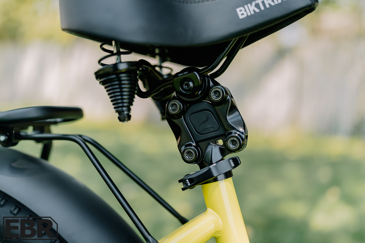 The Biktrix Juggernaut Ultra Duo 4 is built around a solid 6061 aluminum frame, giving it a durable yet lightweight foundation. Up front, you have the option of the standard RST Guide fork with 75mm of travel, or you can opt for the upgraded Wren Sports inverted air fork, which we tested and found to be a nice addition with its positive and negative air chambers. The seat post is a standard 28.6mm with a quick-release clamp for easy adjustments, while the saddle is wide and spring-supported—comfortable, but the look is a bit mismatched with the bike’s otherwise aggressive stance.
