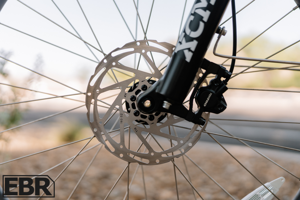 Brakes are Tektro Auriga 2-piston hydraulics with 180mm rotors front and rear. The Auriga is a step up from the HD-350’s we more typically see on most e-bikes and a huge leap in performance when compared to the Zoom brakes used on the previous years of the Atlas, but after enough feedback from owners EVELO stepped up tho these more premium Tektros. While both sets have e-motor cutoff sensors when braking, the difference shows up in modulation and consistency where predictable stopping power on a 66-pound bike that hits 28 mph is a welcomed upgrade.