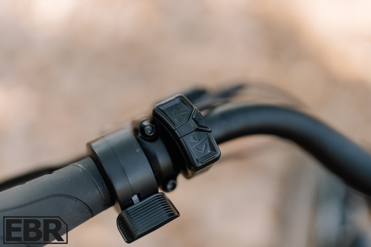 You get either 3 or 5 levels of pedal assistance (switchable in the display menus), plus a thumb throttle on the left side of the handlebar. The throttle is limited to 20 mph, while pedal assist can carry you up to 28 mph, or you can limit it to 20 mph in the display if you want to stay Class 2 compliant in areas with restrictions.