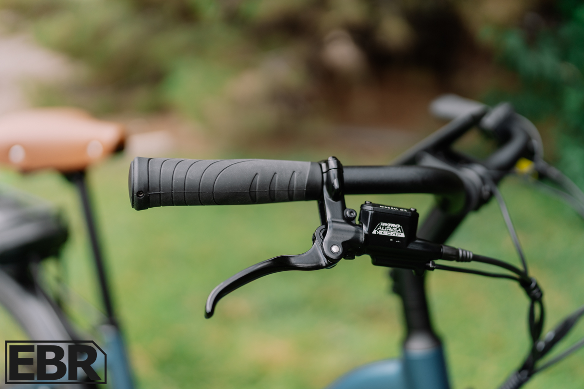 The Tektro Auriga E-Comp hydraulic brakes feature 2-piston calipers with 180mm front and 160mm rear rotors (1.8mm thick). They offer excellent modulation and confident stopping power, which matters on a bike that can hit 20+ mph without much effort.