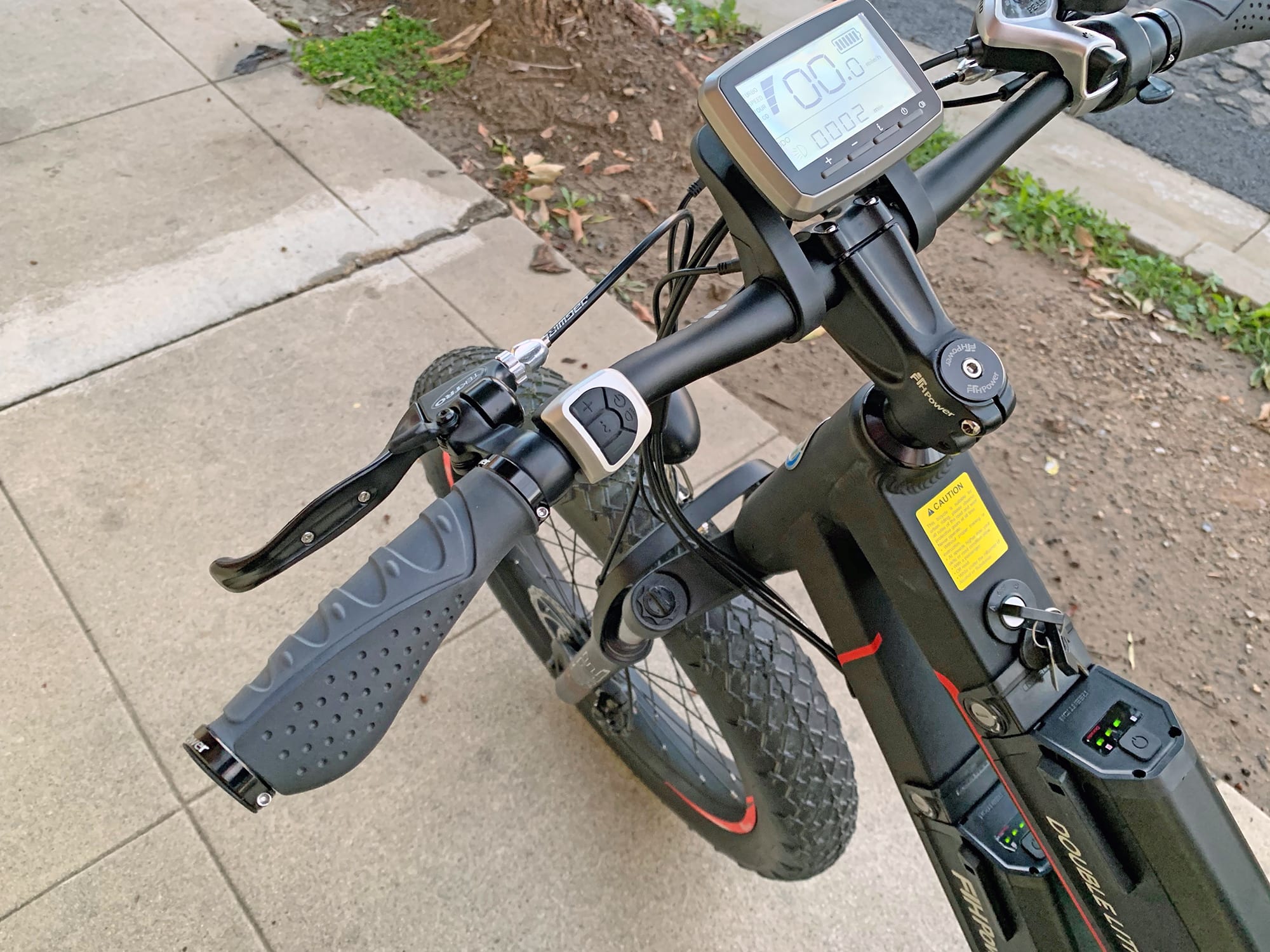 The display is large and easy to read from its size and the backlight. This one is not removable, but it does swivel. Having a large and somewhat tall display though makes me consider it to be a bit vulnerable in the event of a crash. In another point of redundancy, you have a 4 button control pad for the display mounted on the left handlebar, but also have those same 4 buttons to control the display laid out across the lower section of the display itself. I am a little curious as to why they did this, but I suppose it might come in handy in some rare instance where one is easier to get to than the other. The 4 buttons shown are +, -, L (lights), and power. If you hold L and power while booting up for 3 seconds, you get more settings and adjustments. The speed readout is located in the middle while up and down on the left side it shows the mode you are in. The modes are off, eco, tour, speed, and turbo. When you first switch on the bike it will default to that eco mode. 6 separate notches are shown for the battery level, and the rest of the display lets you choose to show odometer, trip, average speed, or time spent on the bike. I love that this display has a USB port underneath that charges at 5v and 1amp. That is defiantly taking advantage of those batteries and I really appreciate that, as most chargers are just 500mA, barely enough to keep a device going, let alone charge it. I noticed when riding this system that if you switch the key over to the other battery really quickly, the display will keep running and you can go from there. However, if you take your time and do it slow, the display will cut out for a moment and need to be turned back on.
