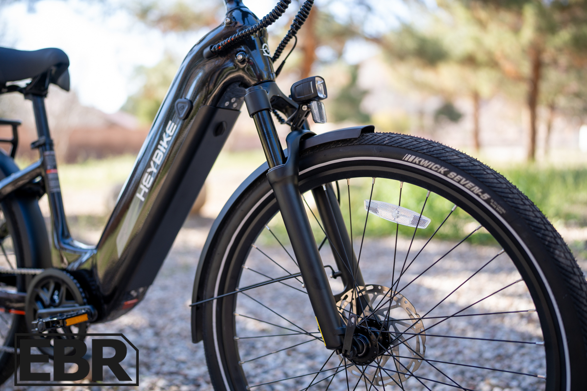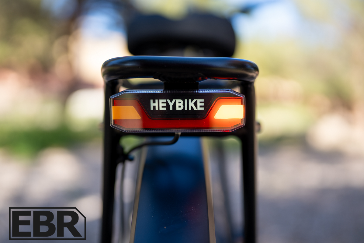 Despite the marketing angle from Heybike of “Our Longest Range Commuter,” the other huge perks that really stand out are the front-to-back fenders with a 60 lb capacity rear rack, full alloy fenders, and front-to-back LED lighting with braking indicators and turn signals. Plus, toss in the tires that have reflective sidewalls and pedals, and you get nearly 360-degree visibility aids when riding in low light conditions.