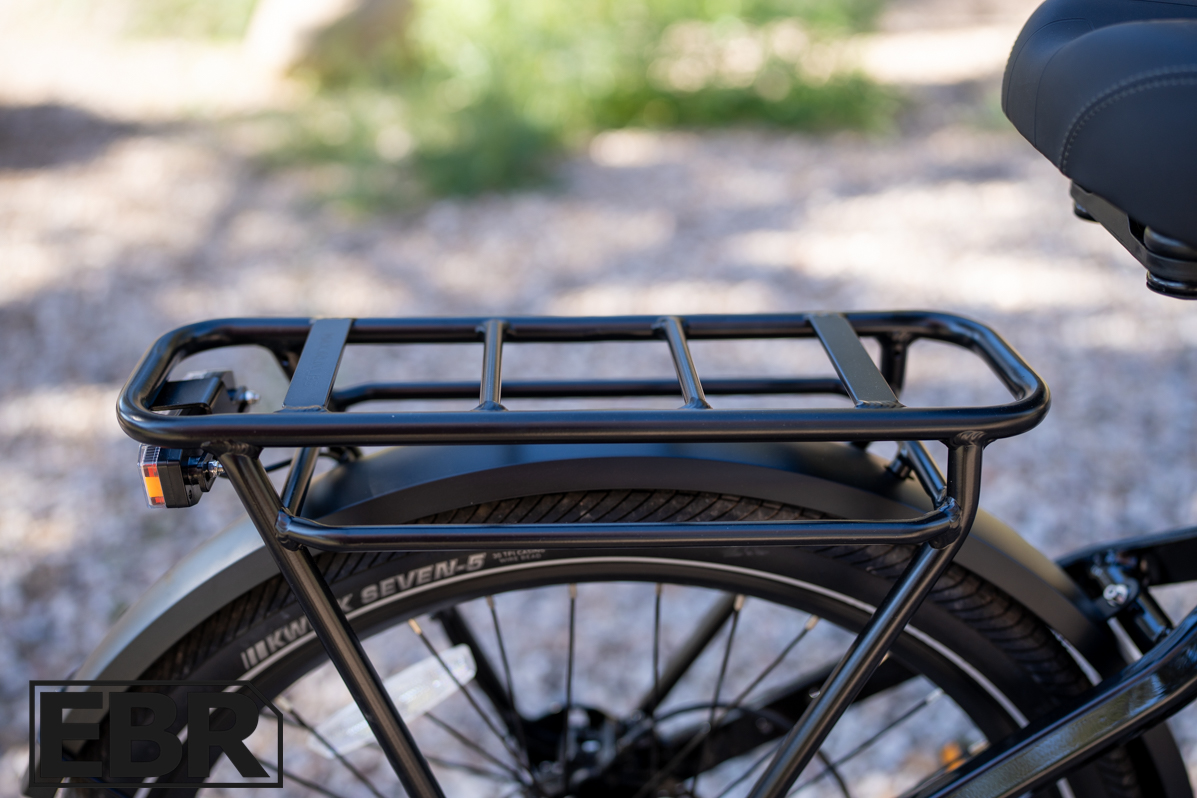 Every bike comes loaded with a kickstand, front to back lighting with turn signals, a rear rack rated for 60 lbs and a 3A charger right out of the box.