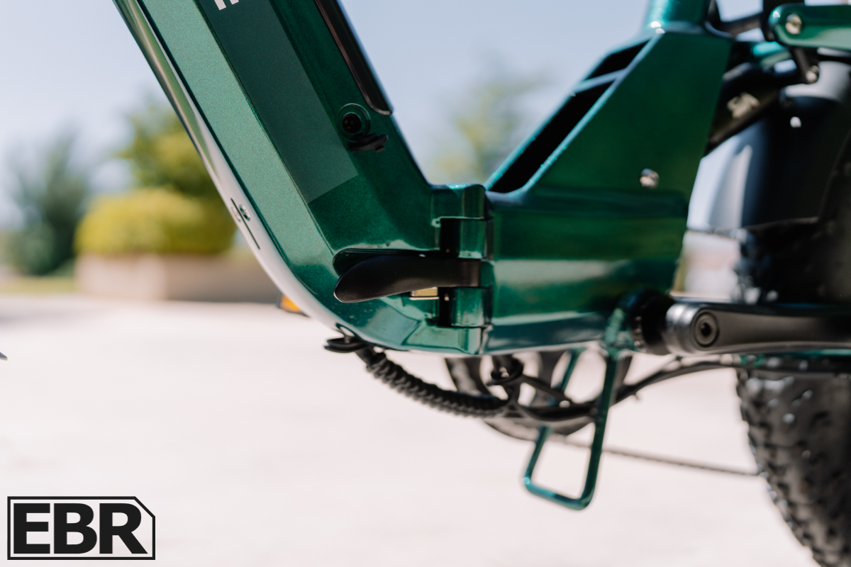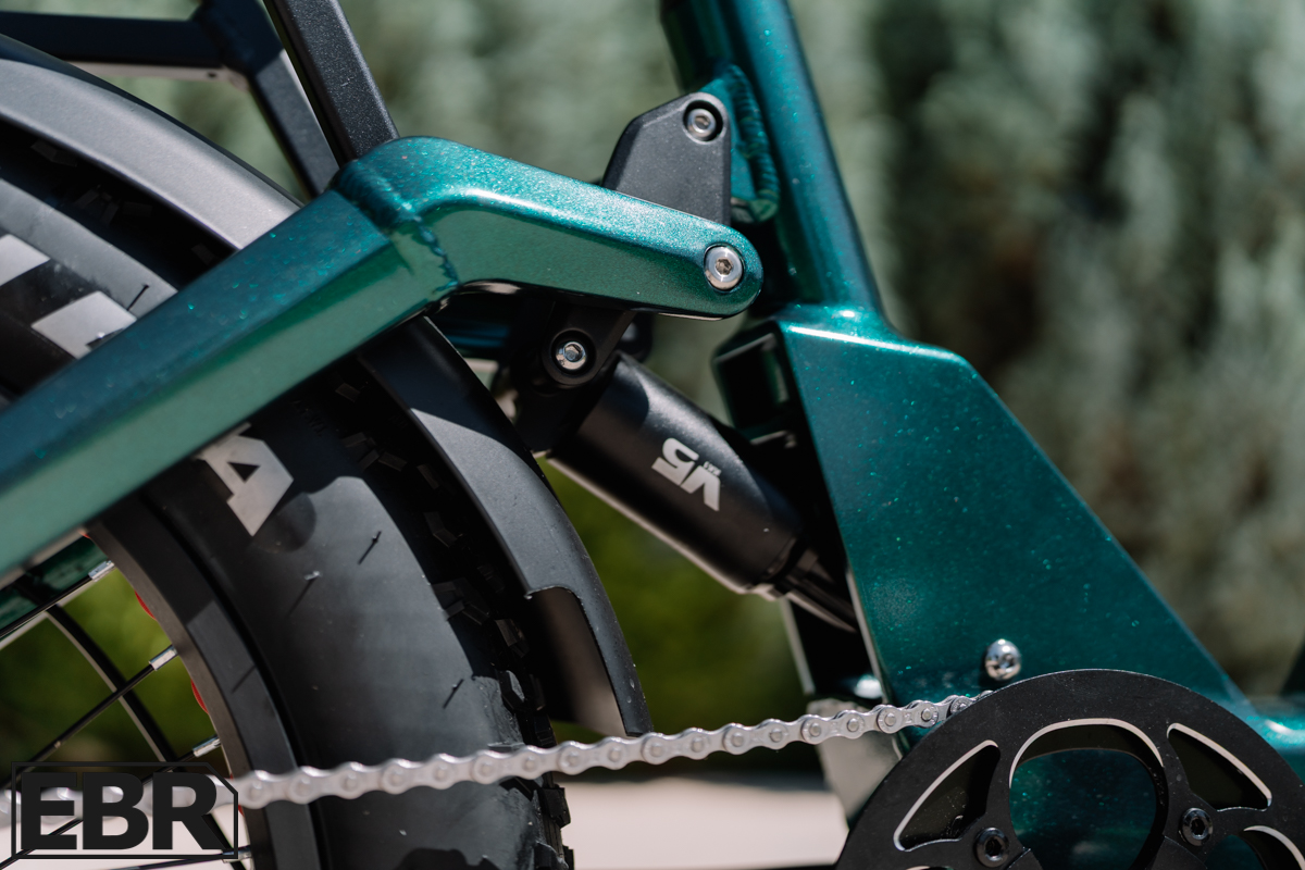 They sent me the Emerald Green for testing, and it’s got this glossy, almost metallic vibe that pops in sunlight against the blacked-out accents on tires, wheels, and suspension, clean and modern without being flashy. At 5’11”, the step-through frame was a breeze to hop on compared to higher step-over designs, feeling accessible right away. I only adjusted the saddle for proper leg extension, but the handlebars sat comfortably at chest level for an upright posture that didn’t strain my back or arms.