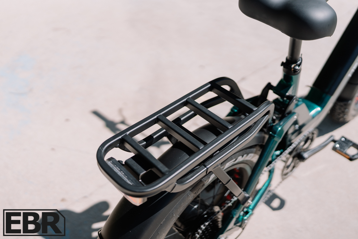 Heybike includes a solid set of accessories right out of the box. It comes with a frame-mounted rear rack for carrying gear, front rack mounting points for extra storage, and plastic fenders on both wheels to keep you clean in wet conditions—functional, if not fancy. The lighting kit is built for real-world use, especially for city riders, with an adjustable LED headlight (complete with a horn) and a rear taillight that includes brake lights and turn signals, making it easier to signal cars and stay safe in traffic.