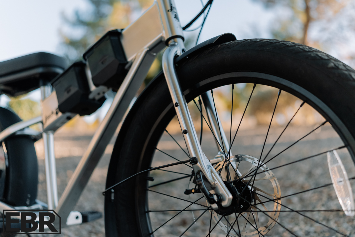 The wheels and tires come in a mullet setup with a 24 inch front wheel and a 20 inch rear wheel, each wrapped in a 3 inch wide tire with a street tread pattern. The roll is silent and smooth, plus they have the ability to compensate for no suspension, as you can air down a bit and create some tire suspension that goes further than you might be expecting when it comes to ride comfort. And both are wrapped in composite fenders in matte black that get the job done.