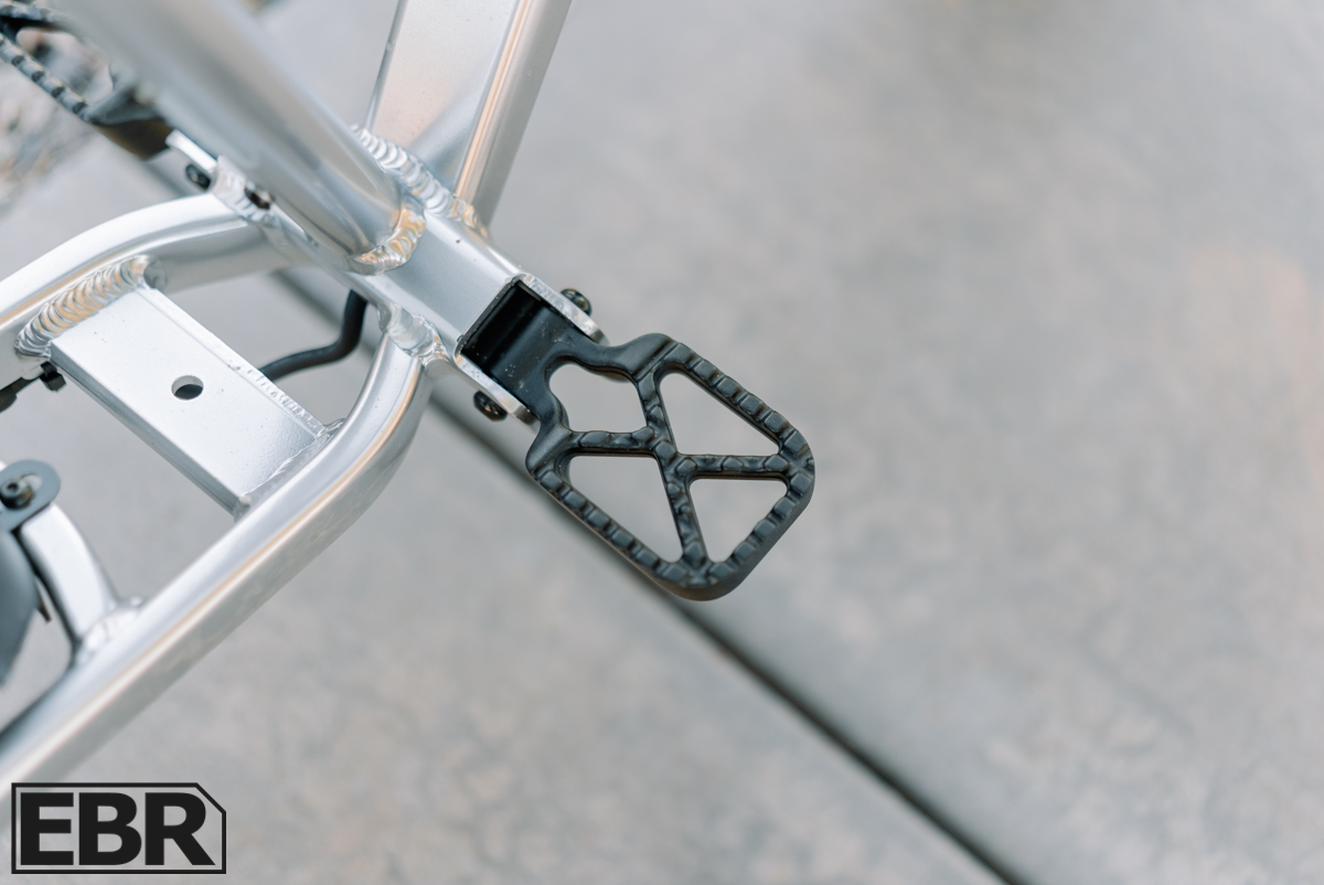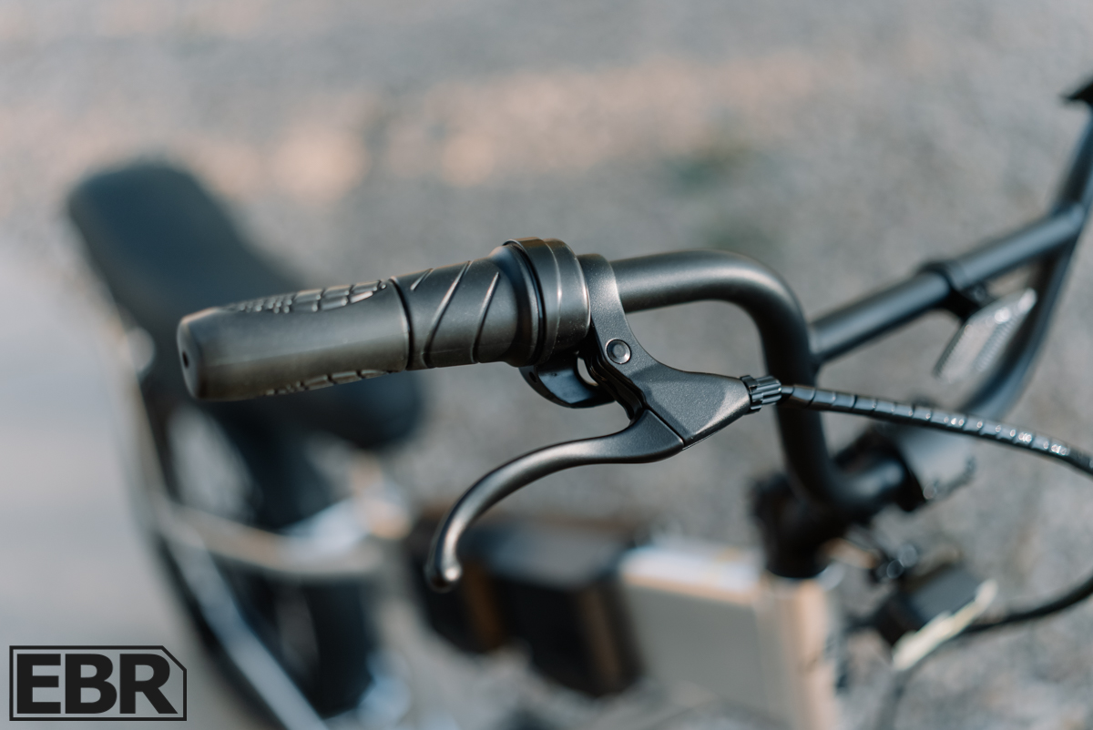 Up in the cockpit, we have a fixed position stem that has a significant rise in it. The handlebars are alloy BMX style bars with a slight sweep back to the rider for a bit more comfortable ride. And while technically you can’t adjust the stem, you can loosen the bolt holding the BMX bars and then push them more forward or bring them back closer to help get your reach and personal comfort level dialed in. The grips are ergonomic black rubber grips and a twist throttle on the right hand side along with the brake levers on both ends.