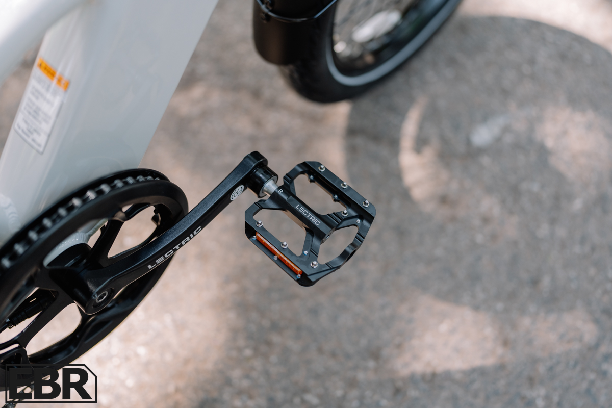In my first spin on the XPedition 2.0, I quickly started forming some first impressions. Right off the bat, you can see some consistent features across Lectric’s newer models, like the quick-release pedals and that trusty M24 motor. Now, with the addition of the PWR+ programming and torque sensor, it really seems to be dialed in for a longtail cargo setup with those compact 20-inch wheels. This combo works surprisingly well—the PWR+ strikes a balance between cadence and torque sensor benefits, which means even a light pedal in a higher assist level gives a solid 300-400W of output, ideal for hauling a load. Then, when you put some real pressure on the pedals, it peaks at around 1310W’s, giving you that extra push right when you need it.