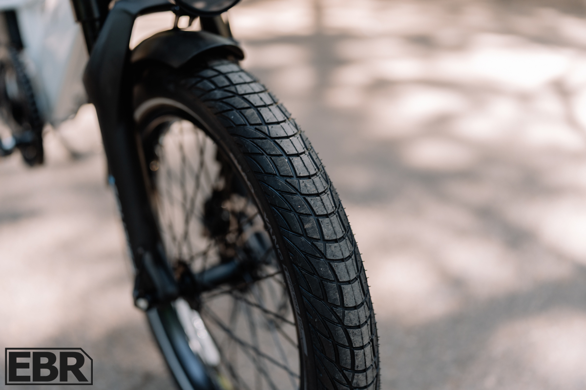 The 20 x 2.5-inch tires are narrower than the typical fat tires you see on some cargo bikes, which might seem unusual, but it actually helps with maneuverability. They’re nimble enough for city riding while still wide enough to support heavier loads without compromising grip, and you still have a little room left to air down for some extra comfort should you have a rear passenger.