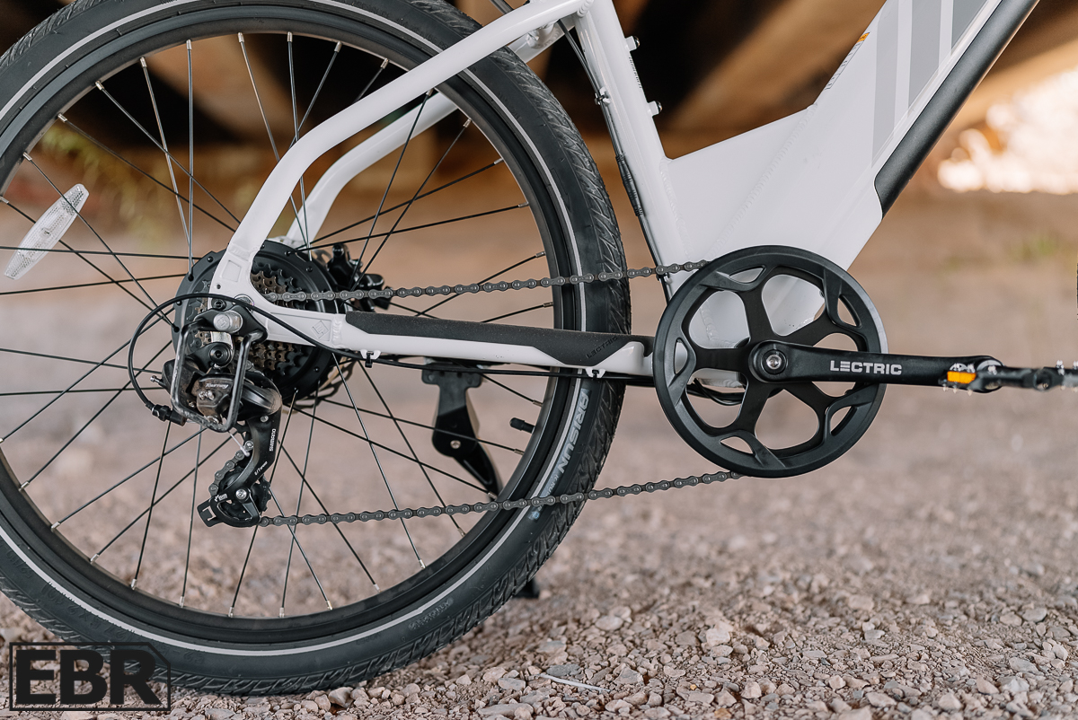 The 500W motor, surprisingly peppy for a “commuter,” has no trouble hitting 28 mph, and the Lectric PWR+ programming keeps the power delivery smooth, even when you’re kicking it up a notch.