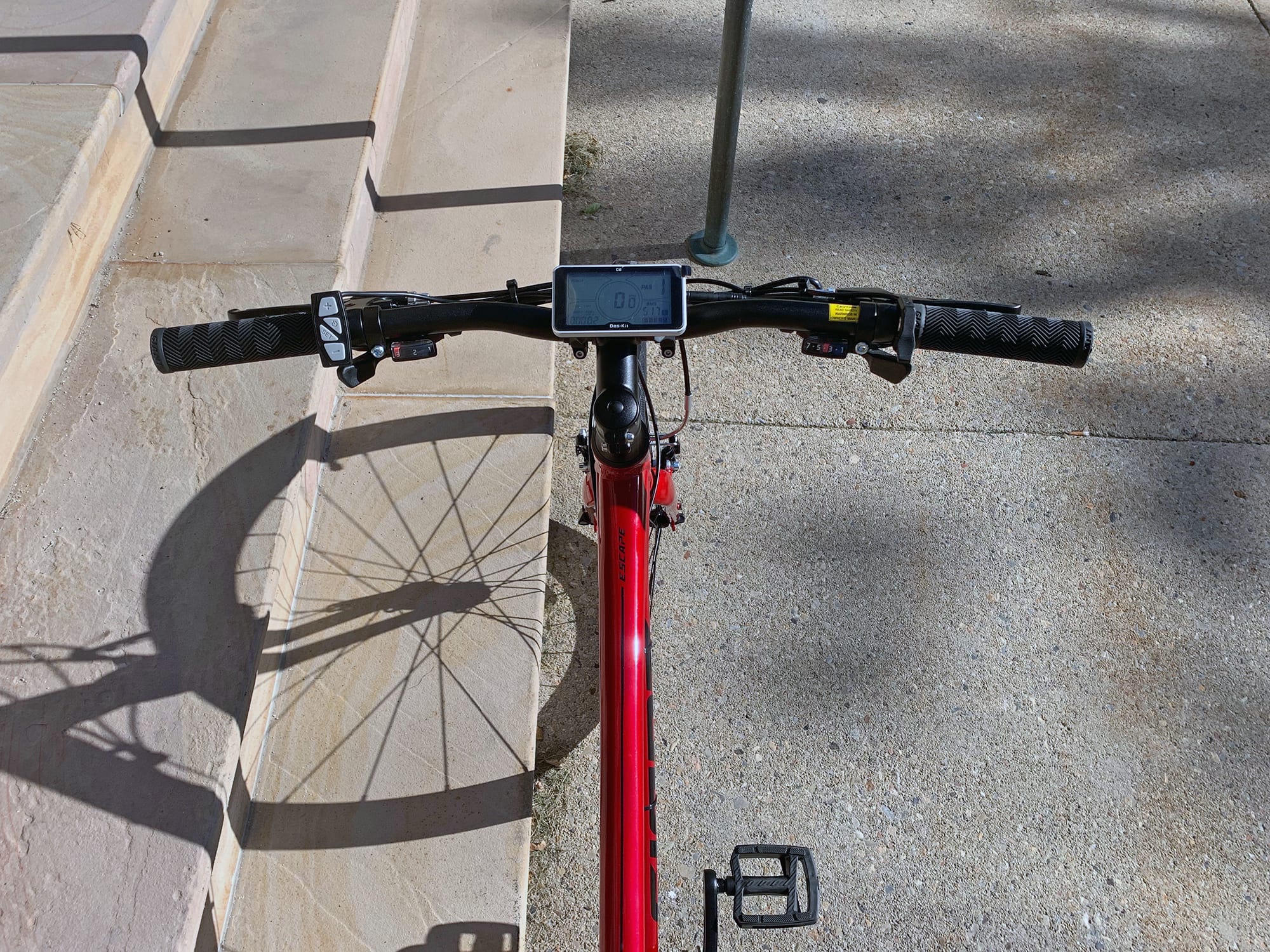 The display for the kit is the Das-Kit C6 display. This swivels and is controlled by the button pad included with the kit. Once the battery has been filled and you’re ready for some electric riding, just hold the power button on the little control pad near the left grip. It activates the display and you get several readouts including assist level, current speed, and battery capacity. The display can show different menus if you press the set button, and as mentioned before, you can lower the top speed to 20 mph or make other changes. For those who plan on commuting, it might be worth strapping your helmet over the display to keep people from noticing or scratching it, and also protecting it from the sun, while parked at racks. Anyways, the bike starts in level 1 and if you have that throttle installed, it is a live throttle so do be aware of that. The pedal assist modes cycle, so if you are in the highest mode and press it up a notch, it will scroll back down to the bottom and vice versa. Overall this is a great setup, but it should be noted there are no USB charging ports of any kind on this display or even the battery for that matter.