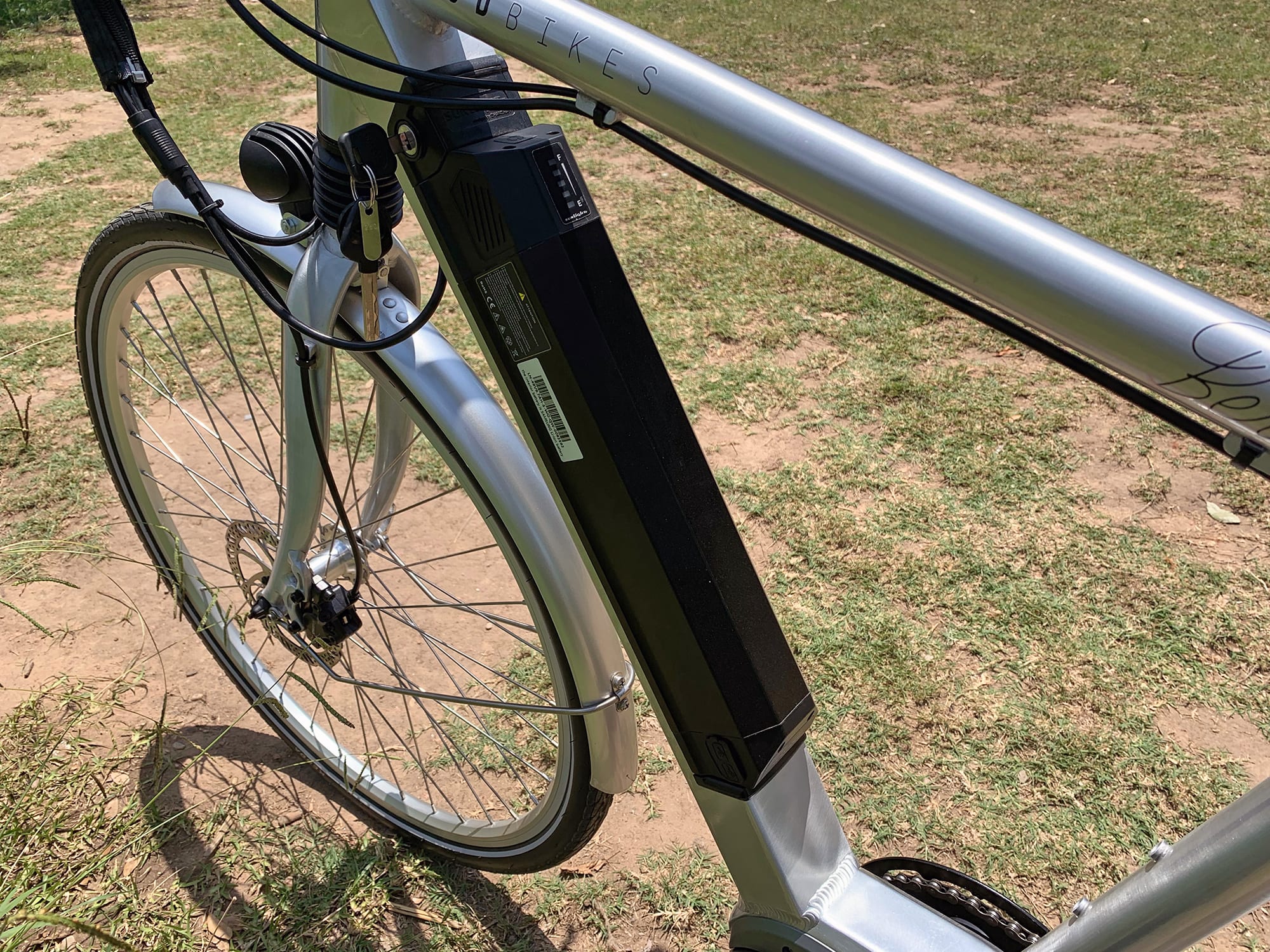 Using the display is pretty straight forward. The display is grayscale, backlit, but I don’t think it is removable. Once the battery is in place, press ‘i’ on the controls to turn it on. You will notice the display come on and ask for a password. That’s right, this bike is password protected, meaning others can’t activate the system unless they know the code. A great feature and I wish they had it on more bikes. Once you see the main screen, it will show battery read out in 5 bar infographic, mode of assist you are in (0-5) wattage read out and speed. If you press ‘i’ it will cycle through readouts from trips, max speed, average speed, and ride time. To turn on the lights, hold +. Now if you turn those lights off and on 3 times in a row, it will active a flashing mode for the front headlight. Pretty cool! Holding + and – together will take you to a settings menu where you can change things like the max speed or even how many levels of assist you want (can go all the way up to 9). Once in this menu, hold the ‘i’ button to save the settings and exit. There is a walk mode too, with a button on the bottom, just underneath the main controls. Finally, I love that they put a 2v charging USB port on the display so you don’t have to charge off the battery down below. It is in a much better spot for charging a phone or GPS and has the right amount of juice to charge new devices like current generations iPhones.