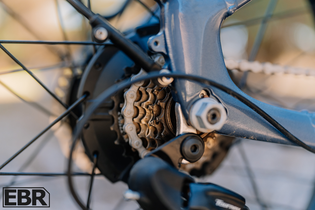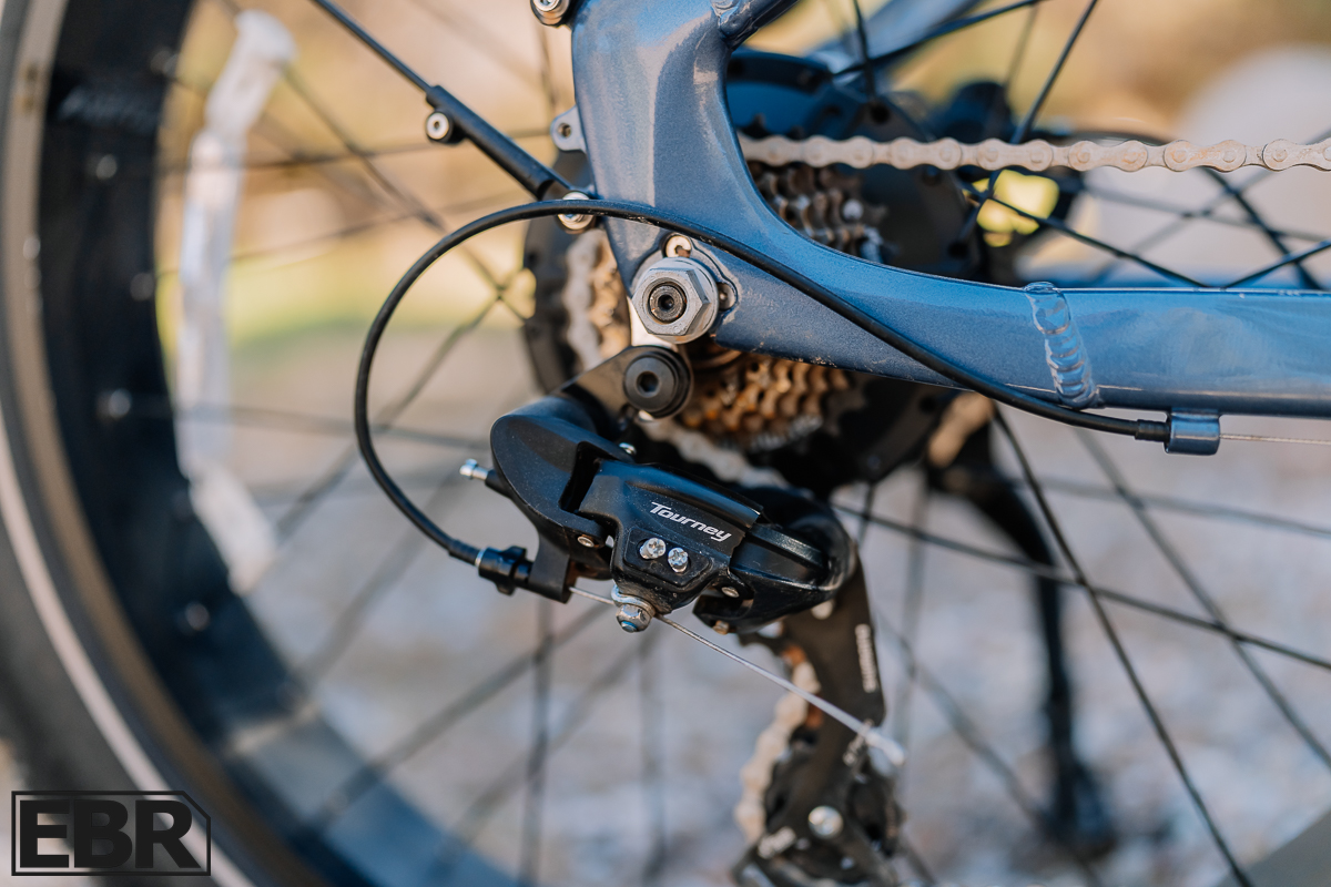 The drivetrain is a Shimano 7-speed system with Tourney components, a 44t chainring, and a 14-28t cassette. It’s adequate for an e-bike, where motor assistance is the primary factor, but I did find myself ghost pedaling once I hit around 25 mph. For most riders, this setup will be just fine, but having a bit more range in the gearing would be helpful, especially if you need to pedal without motor assistance or on longer rides.”