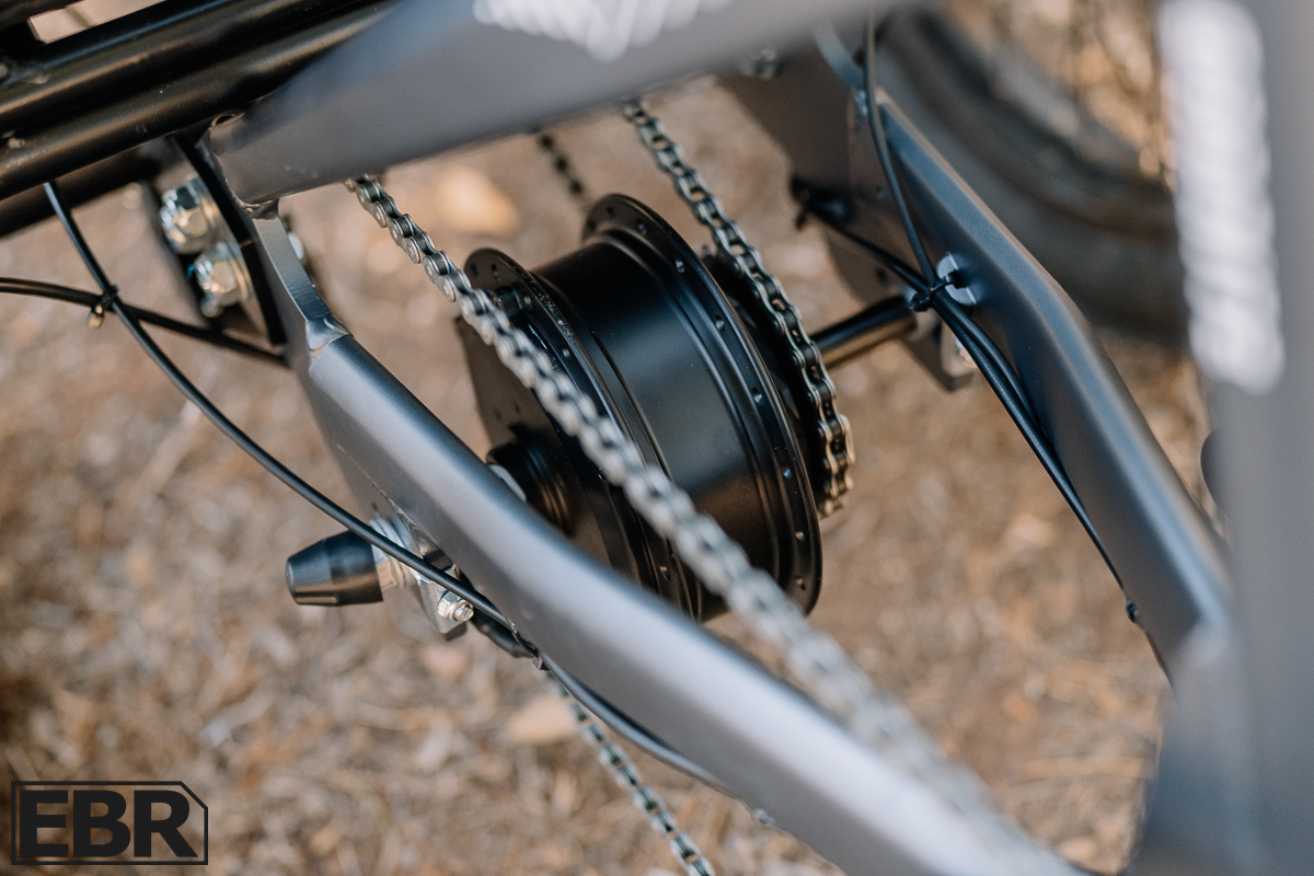 The Granite runs on a 500W rear hub motor (peaking at 860W) nestled between the two back wheels, pushing out 65 Nm of torque – numbers that translate to solid real-world performance for a trike. While the motor stays fairly quiet during regular riding, you’ll notice it gets a bit more vocal when you’re leaning heavy on the throttle at higher speeds.