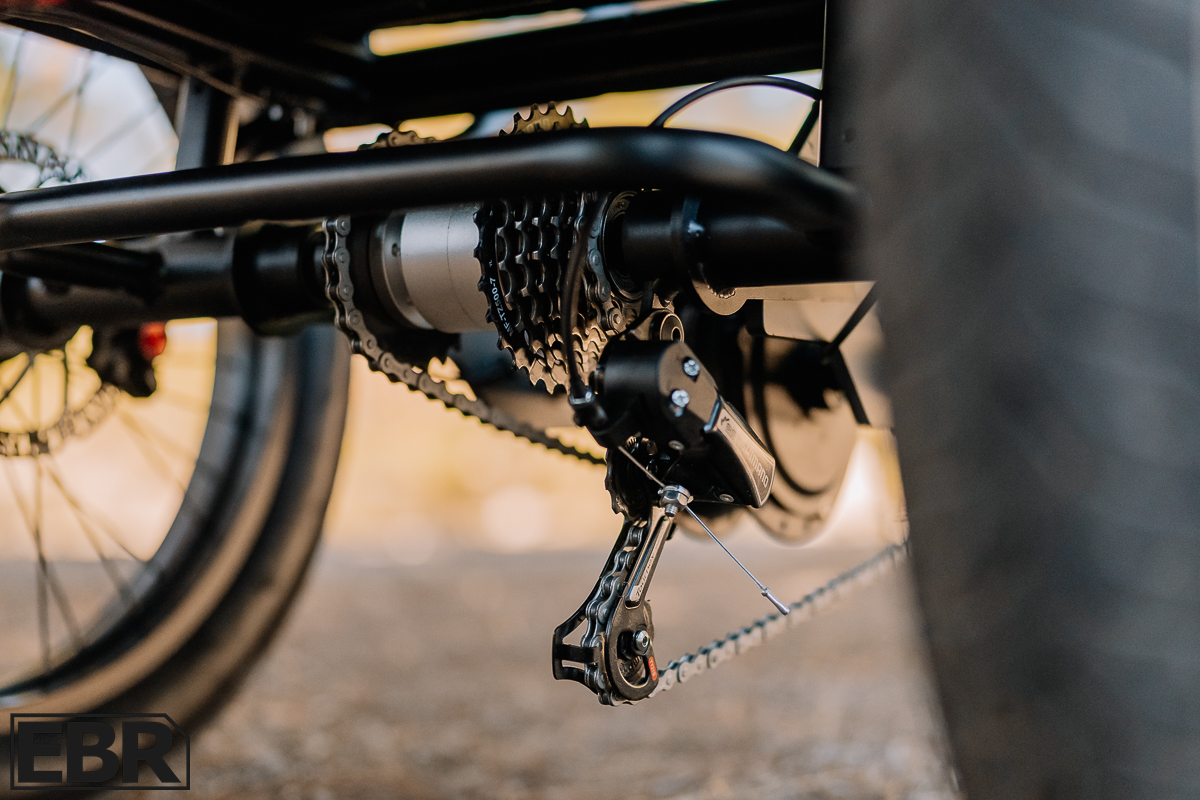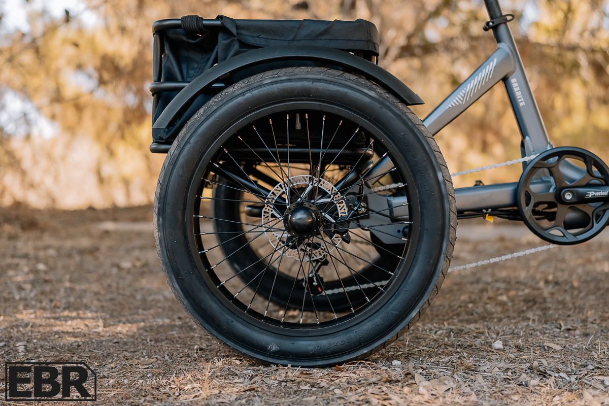 Up front, you’ll find an unbranded suspension fork with 80mm of travel. While it’s not the fanciest fork out there, the 29mm stanchions and adjustable preload and lockout features help smooth out bumps and uneven pavement. The 20-inch wheels are wrapped in wide 3-inch tires, providing a stable platform that makes sense for a trike’s primary purpose: stable, confident riding.