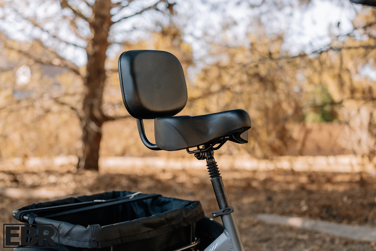 Settling onto the bike (I’m 180 lbs), you immediately notice the cushioning from both the suspension fork and seatpost. The generously padded saddle with its spring support and backrest adds another layer of comfort, though the 19-inch reach feels a bit stretched out for a comfort-oriented trike.