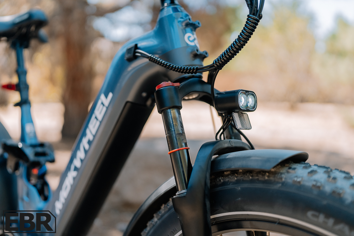 The saddle was surprisingly comfortable, and when paired with the bike’s full suspension—featuring a 130mm coil fork and an RC38 rear air shock—it soaked up the bumps and rough terrain like a champ. I was especially impressed by the stiffness of the step-through frame. Usually, these types of frames have a bit of flex, but Mokwheel seems to have nailed this one. My guess is that the extra frame material supporting the rear shock plays a big role in that added stiffness, giving the bike a more confident, solid feel when riding.