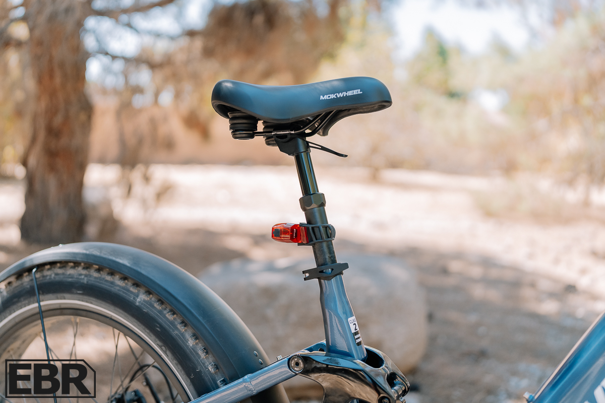 One interesting choice here is the dropper post. Usually, dropper posts are reserved for more aggressive riding, like mountain biking, where you need to get the seat out of the way for descents or technical terrain. That’s not really what this bike is built for. Instead, Mokwheel opted for a dropper because the frame’s linkage design doesn’t allow for a full-length seat tube, so this was a practical middle ground. The dropper offers 50mm of travel plus another 4 inches of seat tube adjustment, which gives you enough range to find a comfortable position. The saddle itself is Mokwheel-branded, spring-supported, and cushioned, which pairs well with the bike’s full suspension to smooth out the ride.