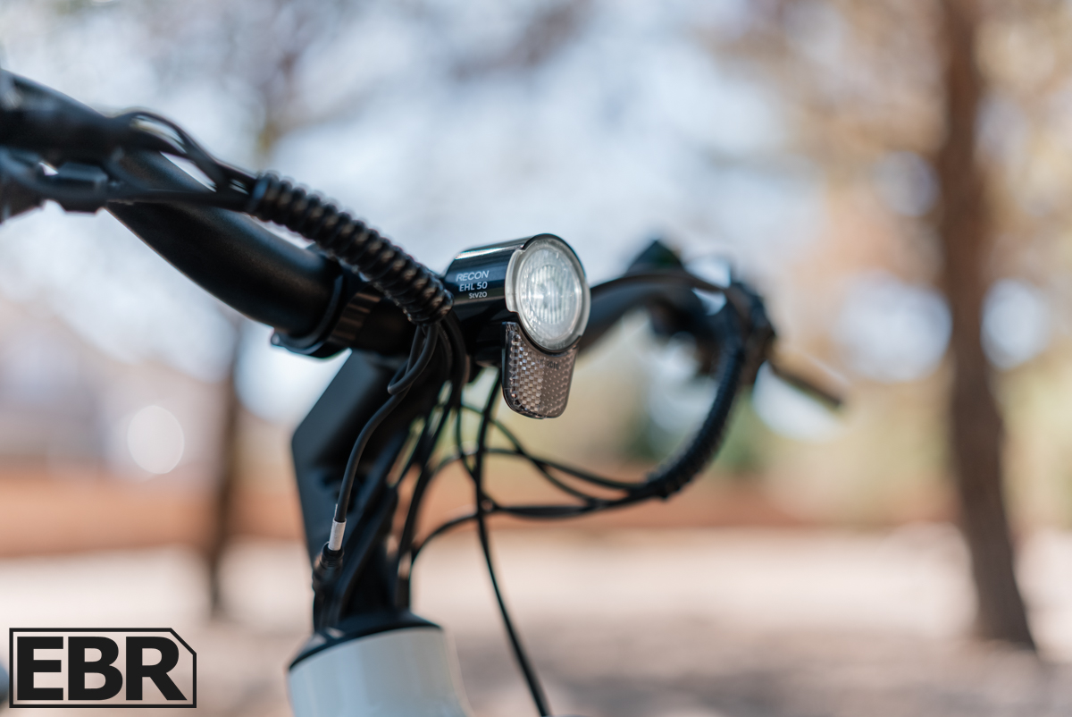 It has walk mode at 4mph, lets you turn the headlight on and off, has adjustable brightness, and connects wirelessly to the RideControl mobile App. You can also change units from mph to kmh by holding the ‘info’ button for 5 seconds, which is handy if you’re metrically inclined.