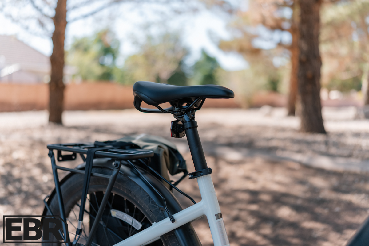 The Luxe saddle is 8 inches wide at its thickest point with micro-adjust rails and even has an underside carrying grip, a nice touch for when you need to haul the bike around. It’s mounted on an alloy seat post with QR adjustability. The ergo platform rubber grips in black tie into the overall design nicely. While the ride is very comfy, I found the saddle a bit stiffer than I’d prefer, but saddle comfort is super subjective, what doesn’t work for me might be perfect for you, and it certainly wasn’t bad.