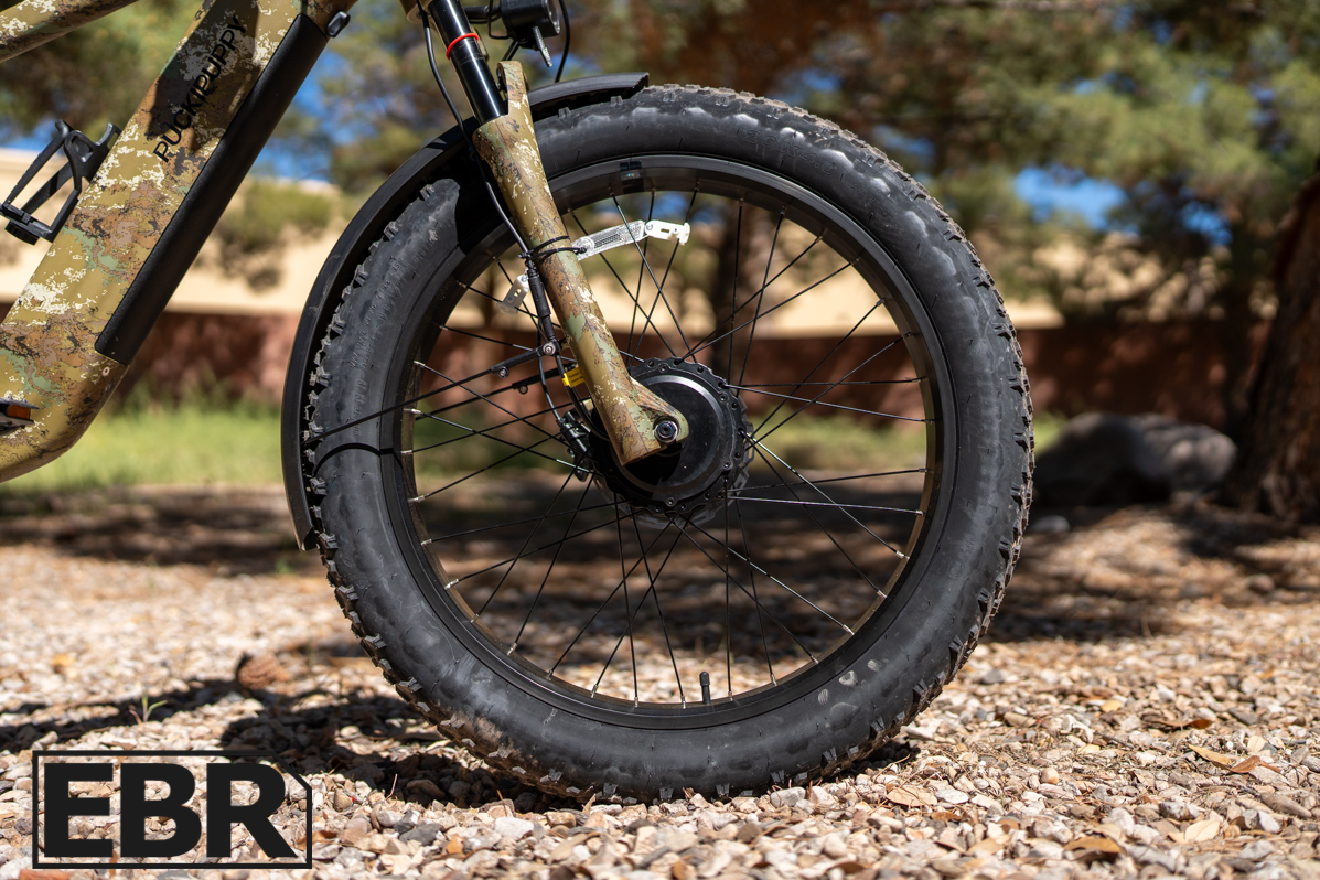 The wheels are a 26” alloy wheel wrapped in 26”x4.0” All-Terrain tires that lend to the GoldenR Pro’s ‘do-it-all’ attitude and hold an air pressure of 5 to 30PSI. Because most fat tire e-bikes don’t have a full-suspension setup, I tend to air down more to let the tires do a little bit of the suspension work. But, being that the GoldenR Pro has a rear shock, I let the tires run closer to 25-30PSI to improve efficiency.