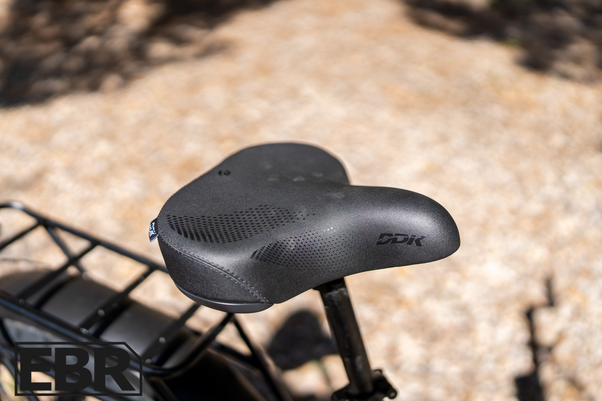 The saddle is DDK branded and has a wide platform with deep cushioning. Pair that saddle up with the GoldenR Pro’s full-suspension and you have a genuinely comfy ride that tackles rough roads without passing that roughness to your lower back as you ride. The handlebar is an aluminum alloy, 28.5”, mostly-flat bar, that does have a slight 15mm rise to it for some extra comfort.