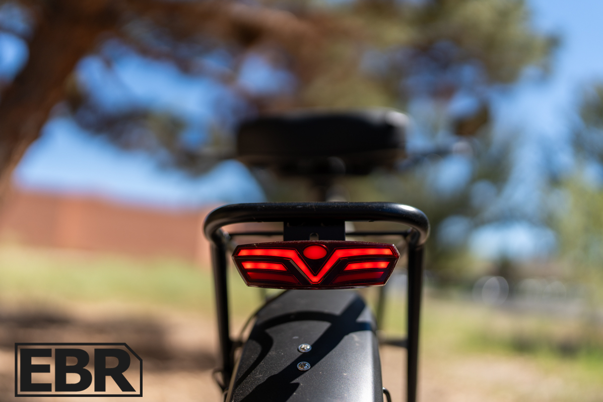Up front, an adjustable-angle LED headlight does double duty, bright enough to actually see the trail ahead and visible enough to be seen by traffic, which isn’t always a given at this price point. Out back, a rack-mounted tail light functions as a brake indicator and includes integrated turn signals, a nice touch for anyone mixing trail rides with road miles.
