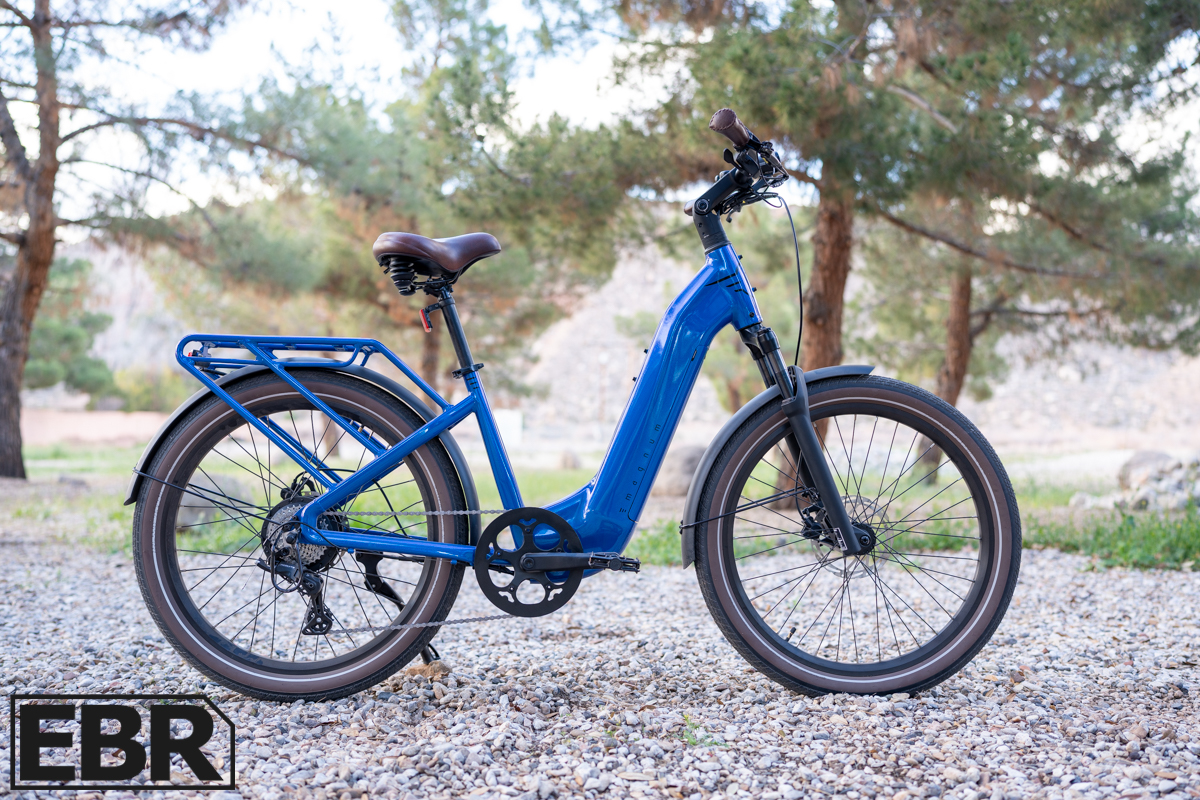 - The step-thru frame positions battery weight further back on the bike frame, which contributes to the rear weight of the gearless motor… so it’s just not as well balanced as the high-step model, especially if you load up that rear rack with a trunk bag or panniers