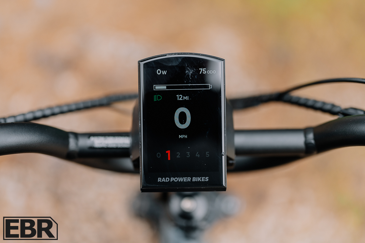 Rad Power Bikes has introduced a new display and it lends a significant improvement over the previous one. First, this one mounts at the center of the handlebar, where it is far easier to look at while riding. Displays mounted near the grip require a rider to turn their head, which can cause many of us to deviate our line a bit, and for some of us to outright veer offcourse. Positioning the display so all you have to do is look down makes things easier and safer.