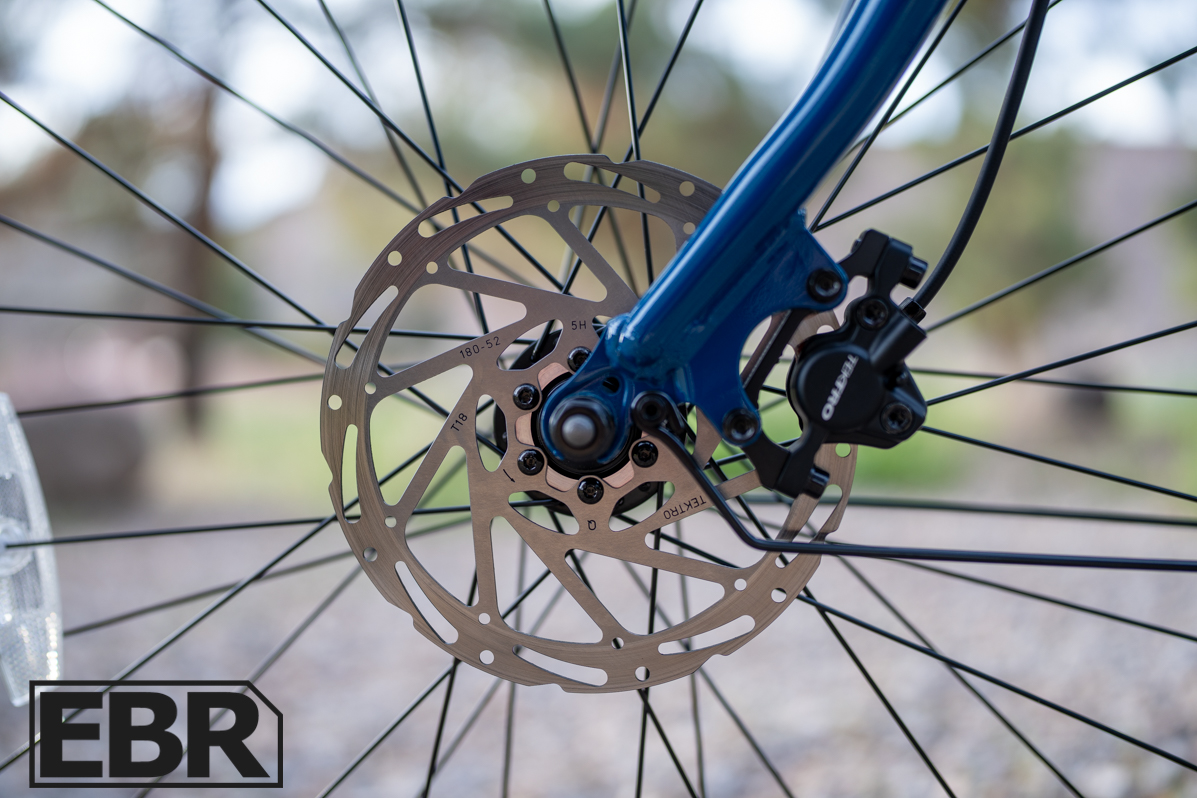 - Hydraulic disc brakes from Tektro with motor cut-off sensors, 180mm rotors and semi-metallic pads give reliable stopping power well above what you’d expect at $1,599.