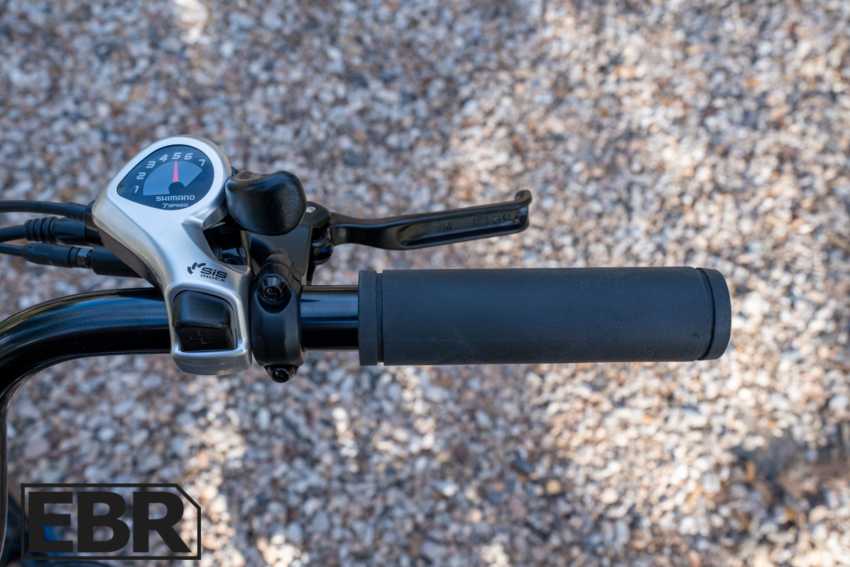 Braking and drivetrain are the usual suspects, and I mean that in the best way. The Tektro hydraulic disc brakes with 2-piston calipers and 180mm rotors, complete with those motor cut-off sensors in the levers, and the 7-speed Shimano Tourney are both industry workhorses at this point. Straightforward, effective and reliable. Exactly what you want at this price point.