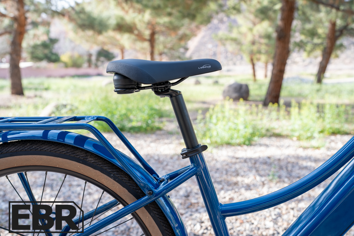 Curb appeal is strong with the new Beaumont Rev+ City. It’s not new for Retrospec to make cruisers that nail the classic vibe of the cool cars of yesteryear, but with some really well-placed and thoughtful upgrades in key areas, it just feels like it mixes old school cool with glossy paint, smooth lines and those gumwall tires with modern Dutch-style city commuter ergonomics. The colorways are sharp, and for my size and fit, the single 16″ step-through frame worked just fine.