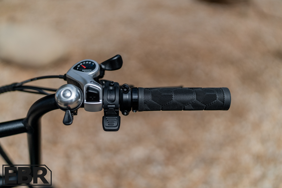 The drivetrain uses Shimano’s Tourney 7-speed system with over-the-bar shifters. You get a 14-34T cassette paired with a 52T steel chainring and double chainguard to keep your pants from getting caught in the chain. Seven speeds gives you enough range to handle starts from stops and moderate hills with pedal assist backing you up, though this isn’t a drivetrain designed for serious climbing without motor help.