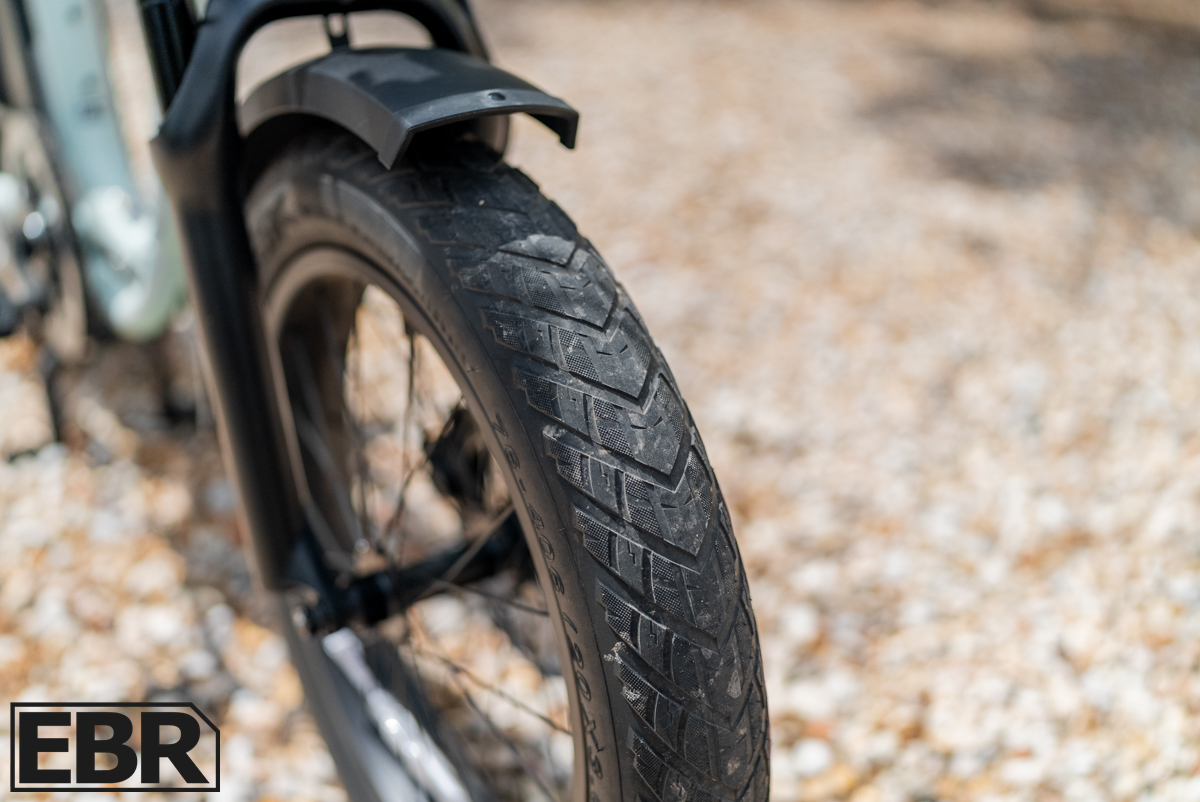 Comfort is covered well between the wide 3-inch tires, the front suspension fork, and that plush DDK saddle. I found the bike comfortable for my typical 45-minute to hour-long rides around town. The fat tires let you run lower pressure for a cushier ride, and the suspension fork does a good job smoothing out potholes and rough pavement without feeling overly soft or bouncy.