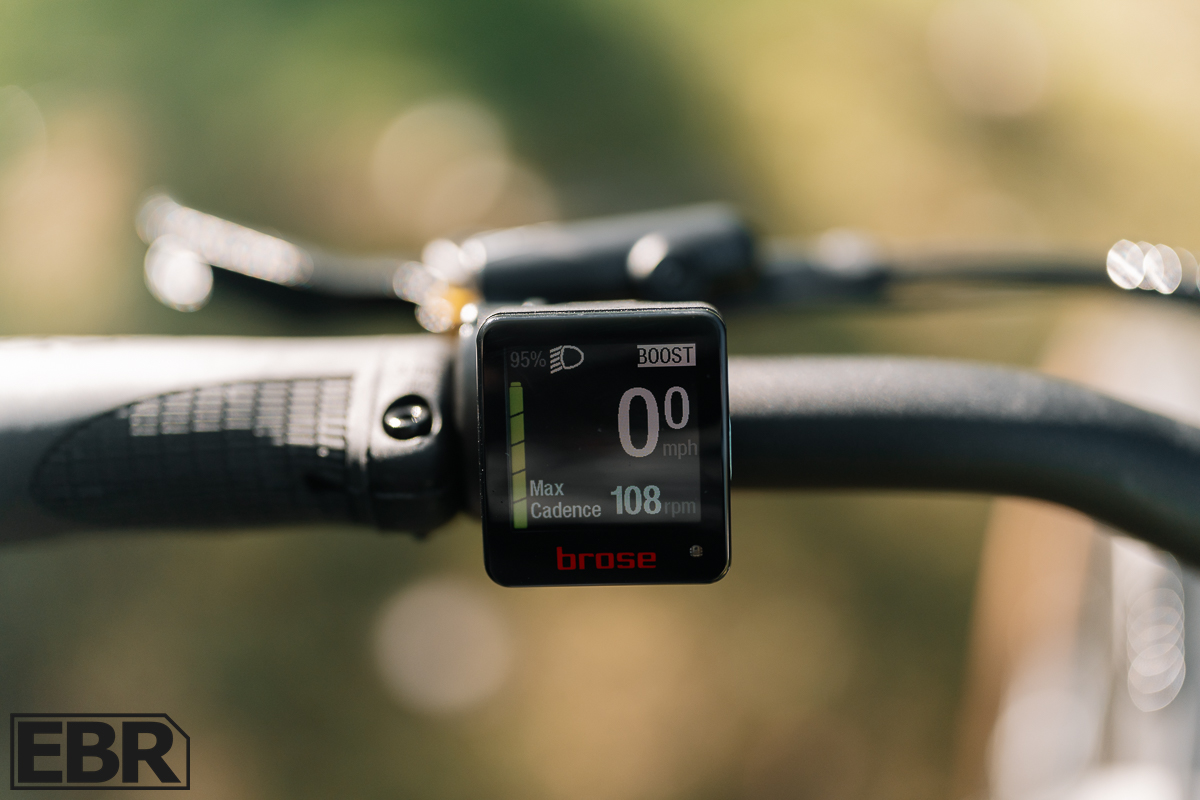The geometry strikes a nice balance—leaning forward slightly with those MTB-style handlebars that have a 45mm rise, but still maintaining enough upright posture for comfort on longer rides. I found the position comfortable and practical for both commutes and longer outings. The Brose Allround display is compact at just 1.5 inches, but it’s a color screen with good contrast, even in direct sunlight. It’s not flashy, but it’s clear and gets the job done.