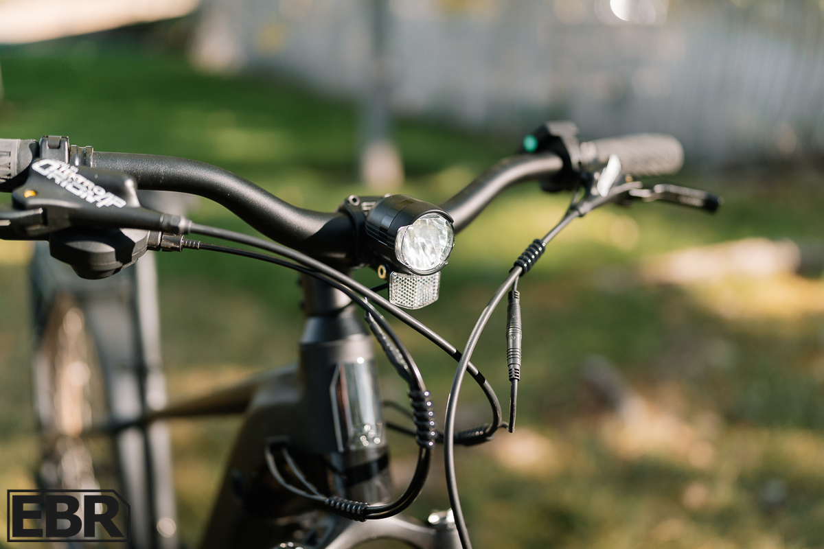 In terms of rider comfort, the V2 has lock-on ergonomic rubber grips and a Selle Royal Viento saddle that I found to be a bit stiff but comfortable enough for my rides. The Brose branded stem is 80mm long and has a 25 degree rise, which pairs well with the 45mm rise MTB-style handlebars, giving you a semi-upright yet slightly forward-leaning riding position.