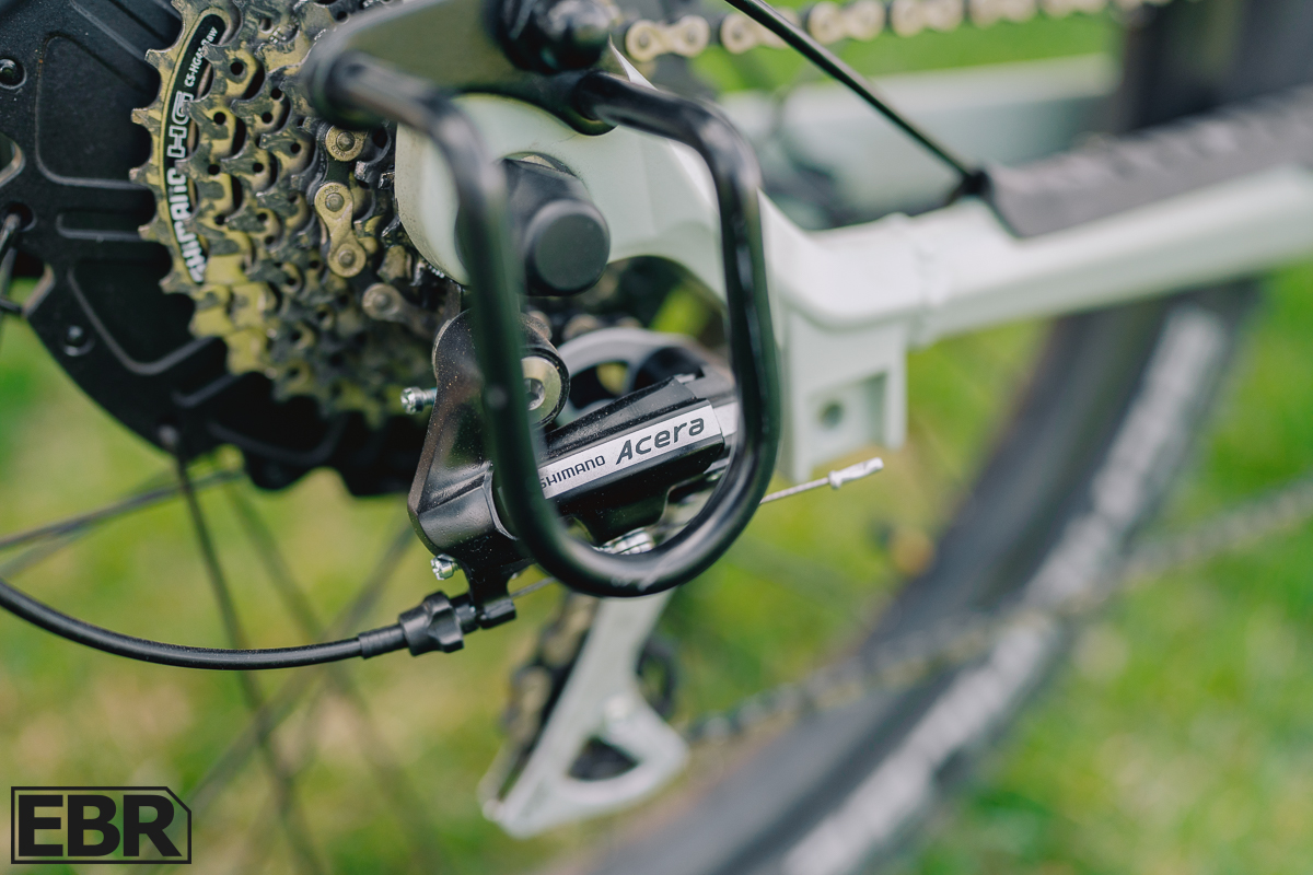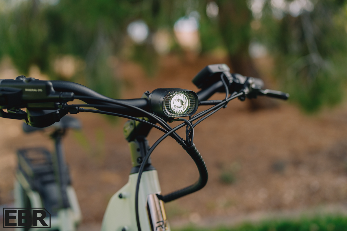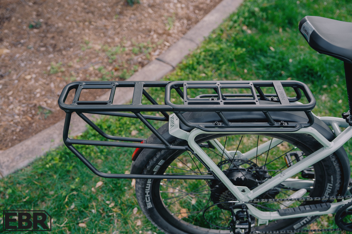 Braking comes courtesy of Star Union 2-piston hydraulic calipers, clamping 203mm rear and 180mm front rotors. The larger rear disc makes sense for controlling a loaded-up Vorsa, and it bites hard when I’ve got gear on the 150 lb-rated modular rack.