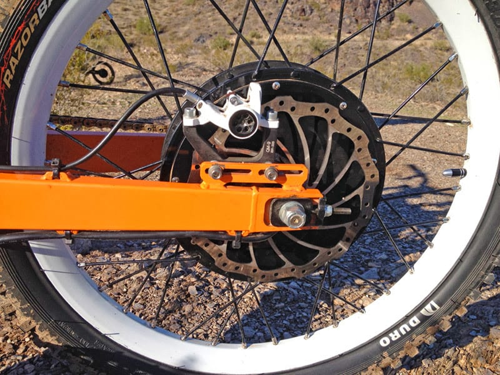 Driving this beast is a 3,000 watt motor (that’s nearly 10x normal electric bikes or those sold in Europe). It’s gearless and offers a regen-mode to help slow the bike down and recuperate energy while saving the brakes. The motor runs pretty quiet considering the size (decibels at 30 miles per hour is 65dB), provides a ton of torque and accelerates very smoothly using the twist throttle. The Cycle Analyst computer monitors the system and is designed to keep the motor from overheating.