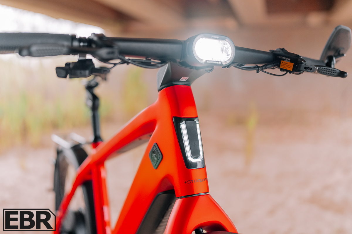 Stromer kitted the ST5 with some high-quality LED lighting as well. At the cockpit, there is a Supernova M99 Pro 2 LED headlight that puts out 1100 lumens in “low-beam” and 1600 lumens in ‘high-beam”. Also, upfront in the headtube, you have a frame-integrated V-shaped LED light that not only provides some ambient light when the bike is powered on but also adds to the overall stealthy aesthetic of the ST5. The rear of the bike has a Supernova M99 LED taillight, which is as bright as you would expect for LED lighting, but I couldn’t find any info on the official lumen rating.