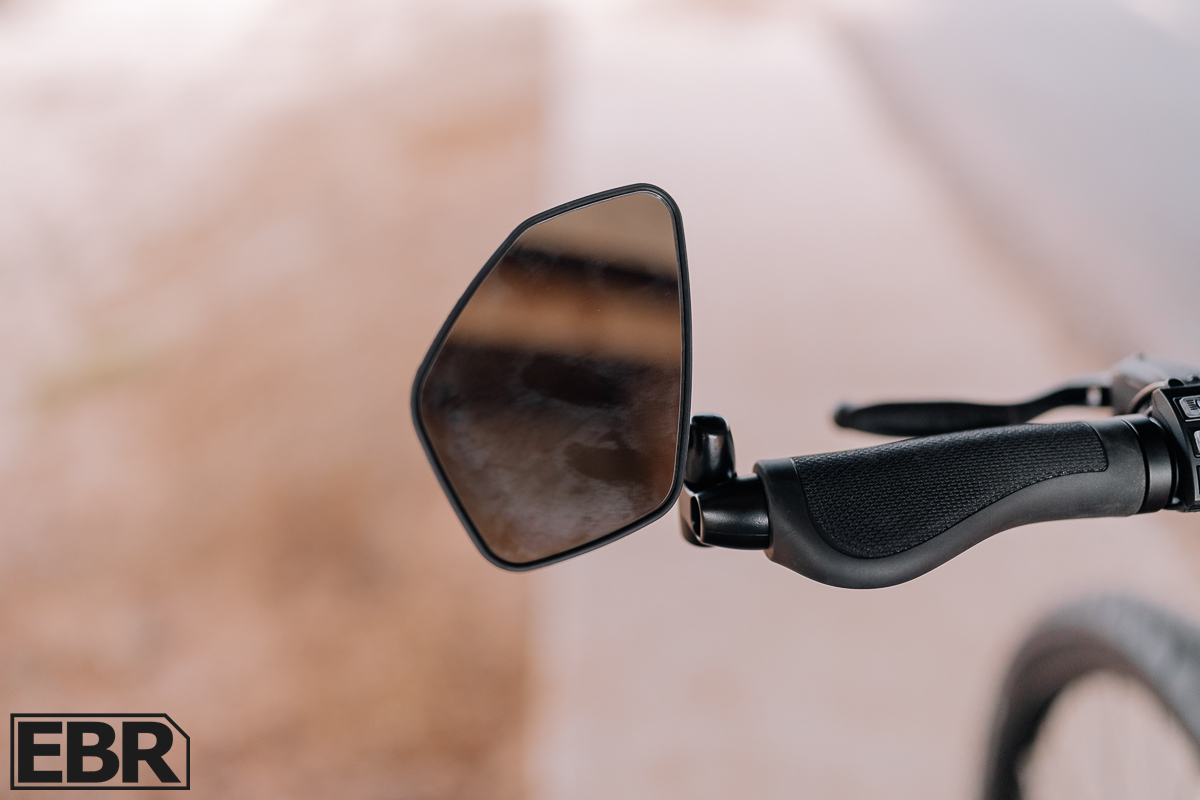 Finally, up in the cockpit, you have a one-piece stem and handlebar design with all cables from the braking and shifter internally routed through the stem and into the frame for a nice, clean look. On the left, you have an included rearview mirror that mounts on the end of the grip, giving a clear view of the road behind you, which I always appreciate when commuting. Also on the left are the pedal assist buttons and a button to activate the LED lighting as well as toggle between high and low beams.