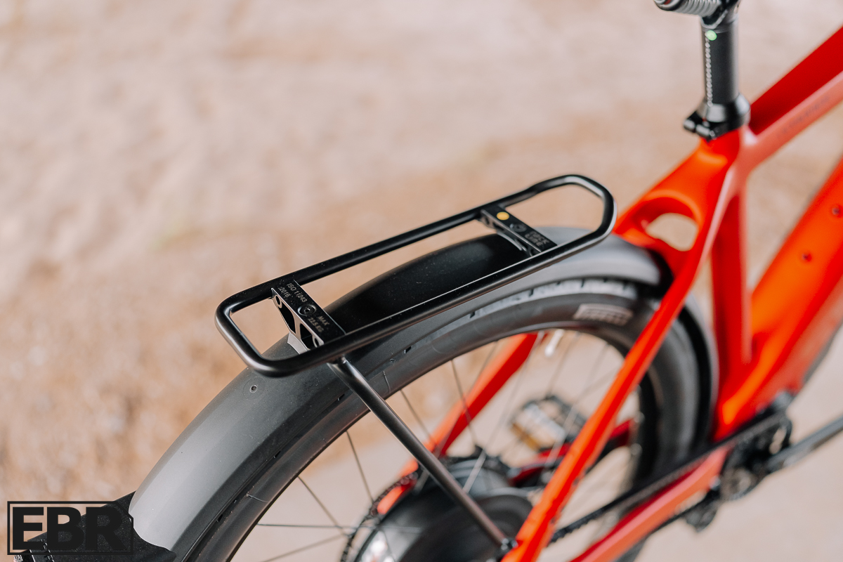 The frame on the Stromer ST5 is all-aluminum and available in 3 sizes (M, L, XL) and in two colors, Imperial Red like we have here, and Adventure Green, both in an attractive matte finish. The frame comes equipped with a rear rack rated for 50 lbs and has two mounting points along the downtube for another attachment option.