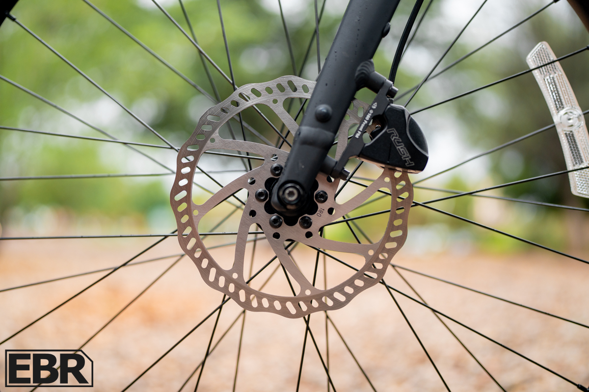 The brakes are made by “Rush,” which was new to me, but I was intrigued to try them out. Braking performance is there with no issues—pretty typical of entry-level hydraulic disc brakes. They’re 2-piston with 180mm rotors, a fairly standard setup at this price point. They also have motor cutoffs for safety, which is great to see.