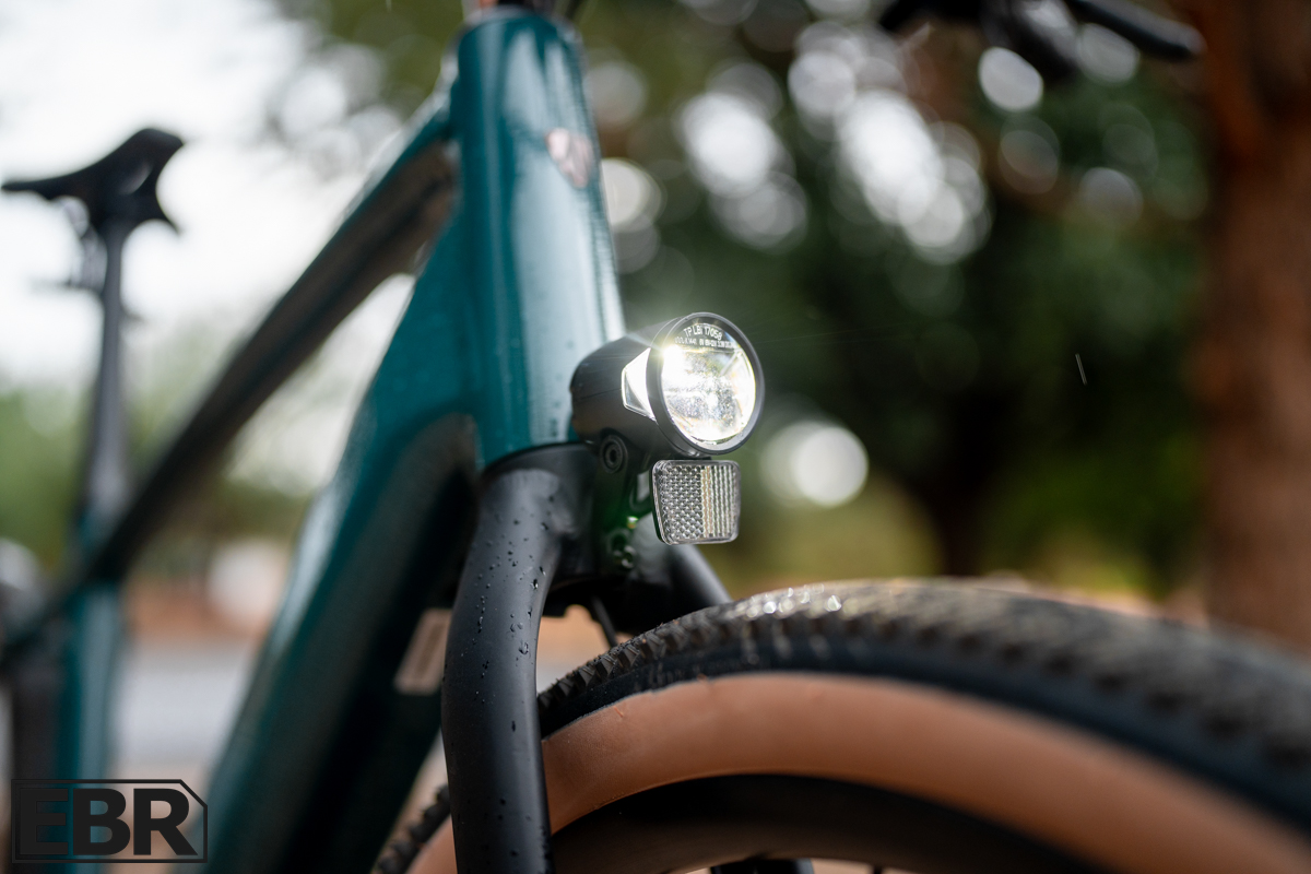 The LED lighting setup includes front and rear lights plus turn signals—great for commuters and safety visibility. Combined with mounts for fenders, a rear rack, and fork arm bags, this bike is equally comfortable taking you to work as it is hauling you on a weekend overnighter in the backcountry.