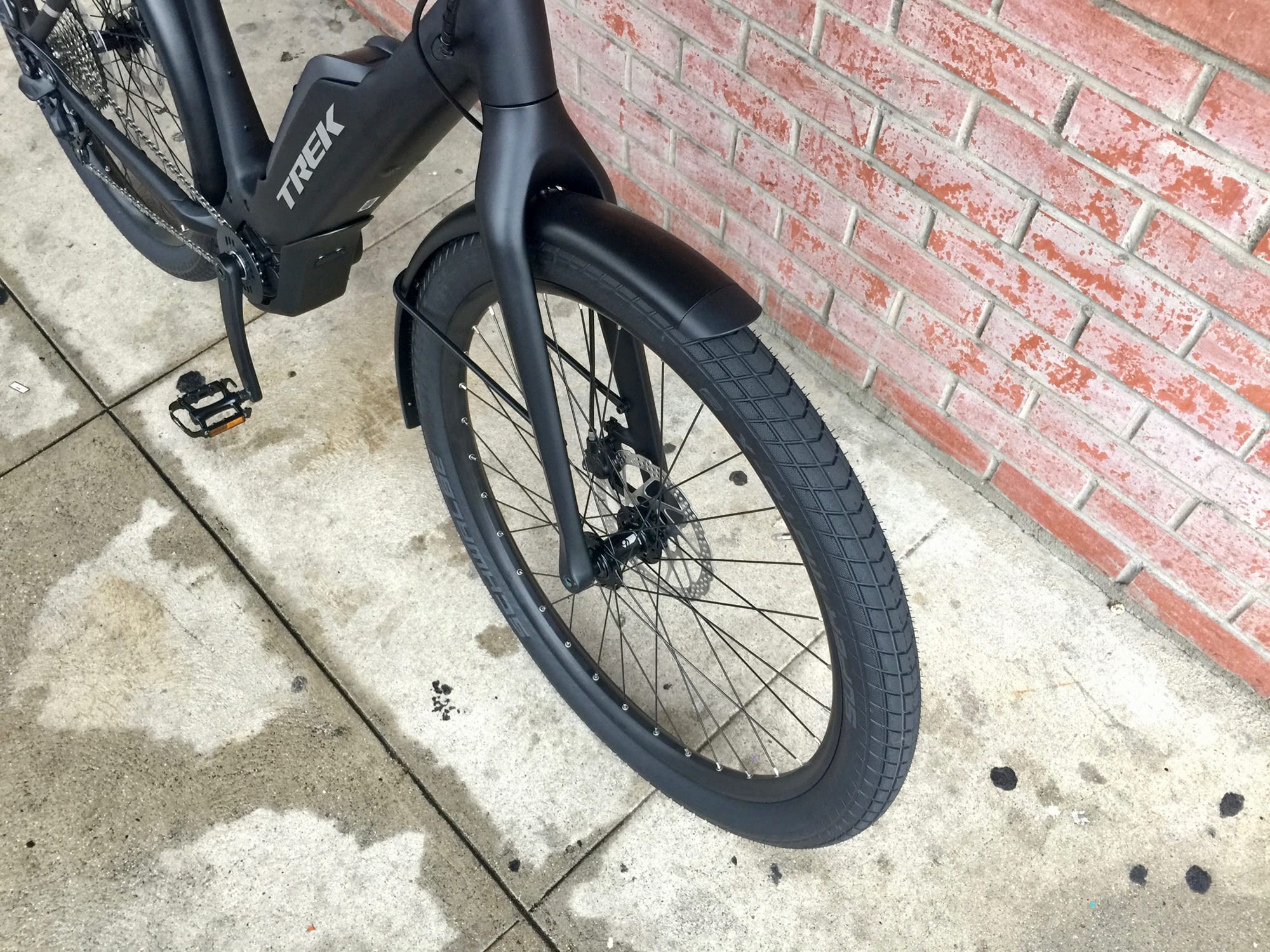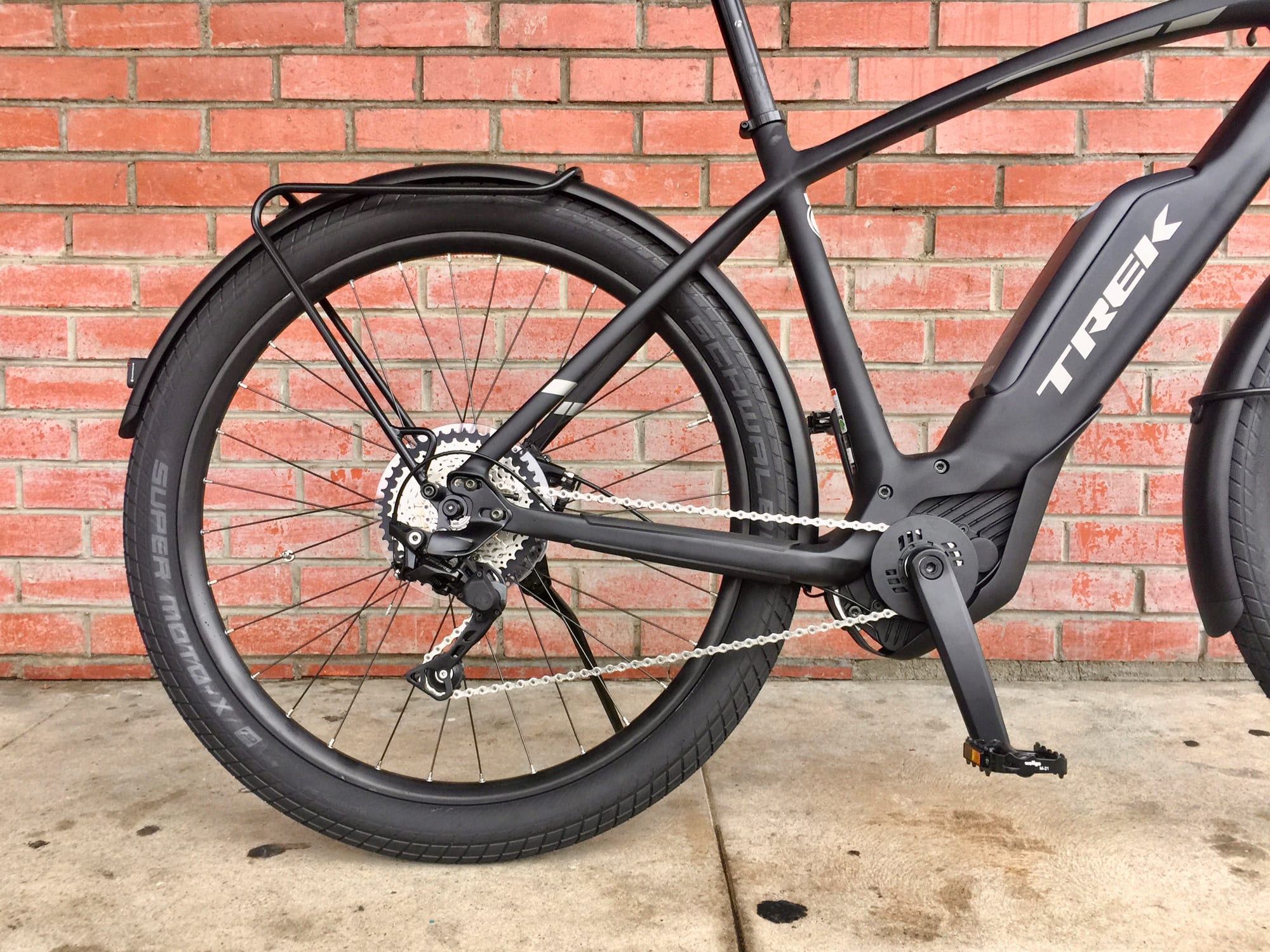 The Trek Super Commuter platform is beautiful, sturdy, and feature rich. I’ve been a longtime fan of the Bosch drive system and appreciate the sporty Performance Line Cruise motor here. If you are alright with a 20 mph Class 1 electric bicycle, you’ll save some money and get better range here than with the 8S… all without compromising too much on actual ride quality. The Schwalbe Super Moto-X tires are durable and comfortable, the 180 mm Shimano hydraulic disc brakes are easy to use and feature adjustable levers. Five frame sizes means you’ll fit the bike properly, and the Trek dealer network means that you’ll get some help in that process. I was really excited to see the new Super Commuter+ 7 and test it in the rain because the fenders are much nicer than I see on other ebikes. They are quiet, fairly wide (about 70 mm), and integrate well with the rear light and rack. Yes, I still got a little wet when turning and positioning my feet forward and down, but it was much better than having no fenders. Big thanks to Helen’s Cycles in Santa Monica California for letting me test ride one of their showroom floor models! We got the bike wet and dirty, and they volunteered to clean it up… and this is another great point, the electronic systems from Bosch are all very well sealed against water. Trek has used a sealed bearing design for their steering headset and bottom bracket spindle integration so you won’t get rust and creaking. Final thoughts: the brakes here are a step down from the 8S but still very good (Shimano M316), you only get 10 speeds vs. eleven but that’s a great fit for 20 mph (and I was able to reach 23 mph pedaling briskly on flats), and neither wheel offers quick release so you’ll need a tool for fixes on the go (a 6 mm hex for the front wheel and 5 mm hex for the rear). Big thanks to Trek for partnering with me on this post! I’ll do my best to answer questions in the comments below as well as the Trek electric bike forums.