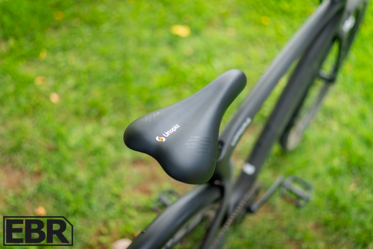 I was sent the large frame in the matte black finish, which looks absolutely premium in person. Urtopia also offers the bike in an off-white matte color called Creme if black isn’t your thing. The standover height on this large came in at 33 inches, which gives you that high-step frame geometry without feeling cramped or awkward.