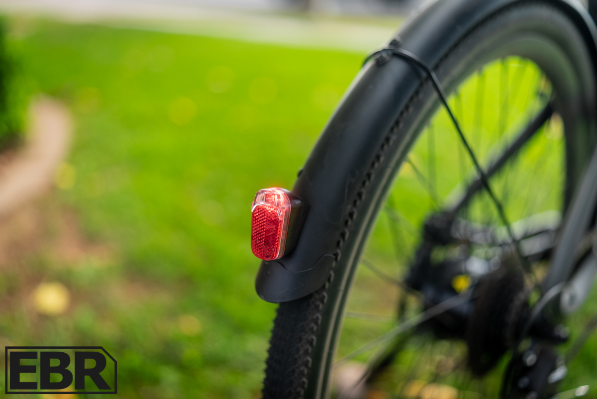 Every Carbon Classic ships with the essentials already installed. You get a kickstand, front and rear plastic fenders, a 30 Lux front LED headlight, a rear tail light mounted on the fender, and flat pedals. It’s ready to ride out of the box.