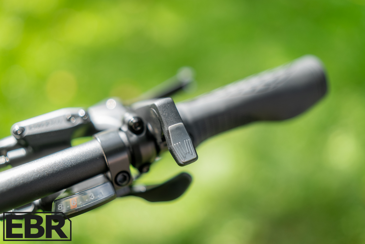The throttle sits on the right side of the cockpit as a simple push-style button, trigger shifters handle gear changes, and the Tektro brake levers have adjustable reach to fit different hand sizes. No unnecessary complexity, just straightforward controls that work.