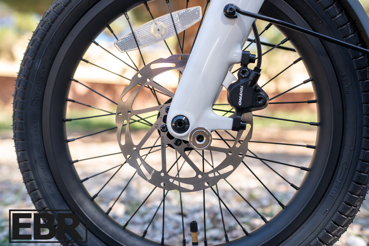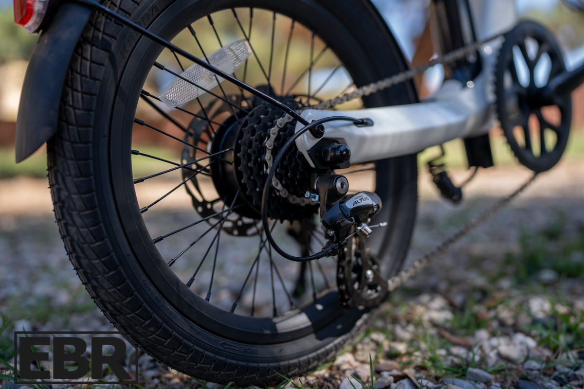 The Fold 2 rolls on 18″ x 2.0″ tires, which are smaller in diameter than what you’d find on most ebikes but slightly wider than you might expect on a folder. The smaller wheel size contributes to the compact folded footprint and keeps the overall weight down, while the 2.0″ width gives you enough contact patch to feel stable and planted on pavement and light gravel.