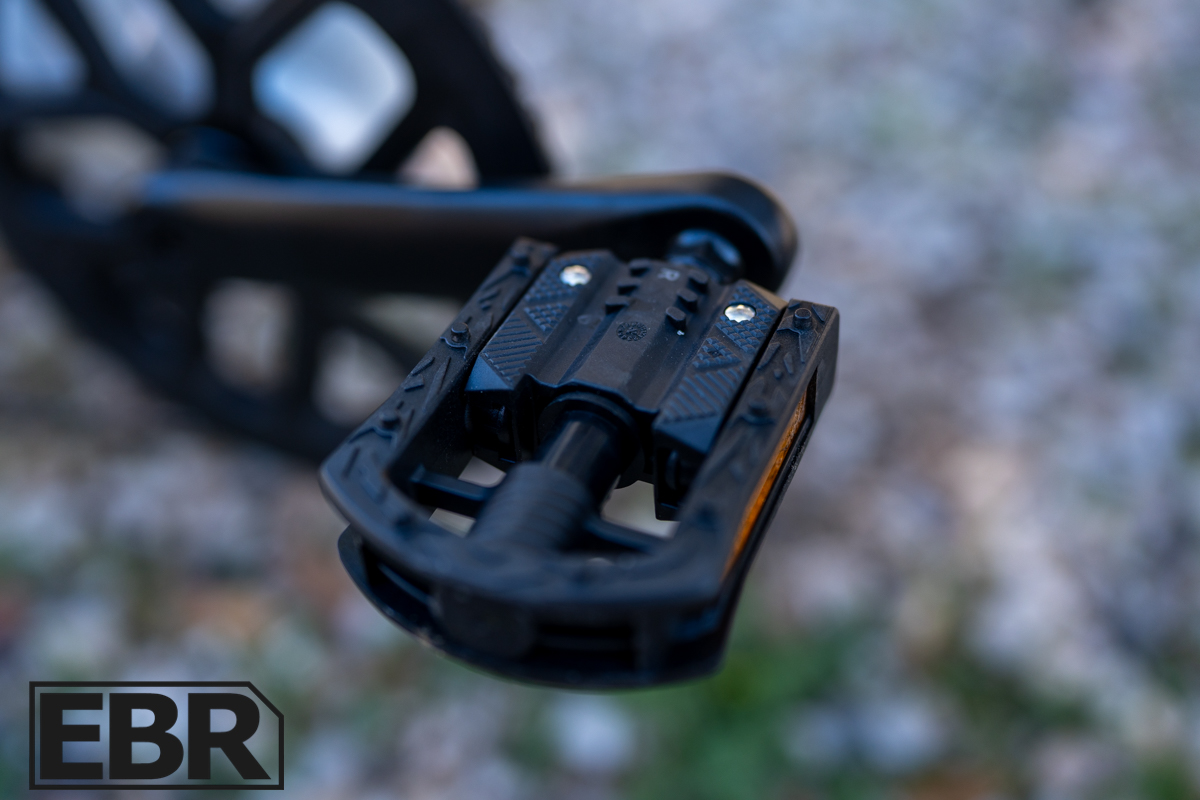 The Carbon Fold 2 runs a Shimano 8-speed drivetrain, which gives you a solid range of gears to work with across varied terrain. The pedals are plastic folding units, which is the right call on a folder, they tuck out of the way when you’re carrying or storing the bike, and it’s one of those small details that adds up when you’re actually living with the bike daily.