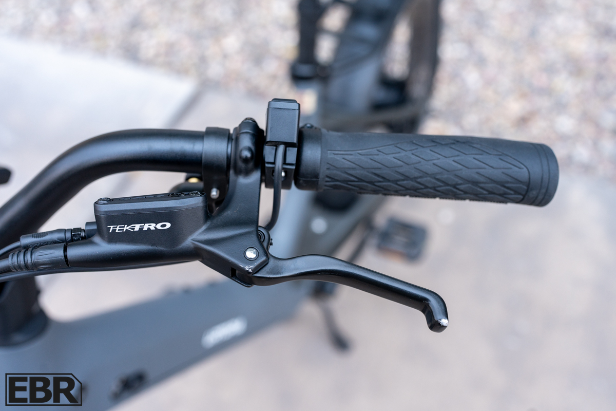 The braking system uses Tektro hydraulic disc brakes with 180 mm rotors that measure 2.0 mm in thickness. This is a fairly standard setup for many e-bikes and provides consistent stopping power without requiring frequent service. The brake levers include e-cutoff sensors that kill motor power the moment the brakes are pulled even slightly. This is helpful for safety when maneuvering at low speeds or when making quick stops.